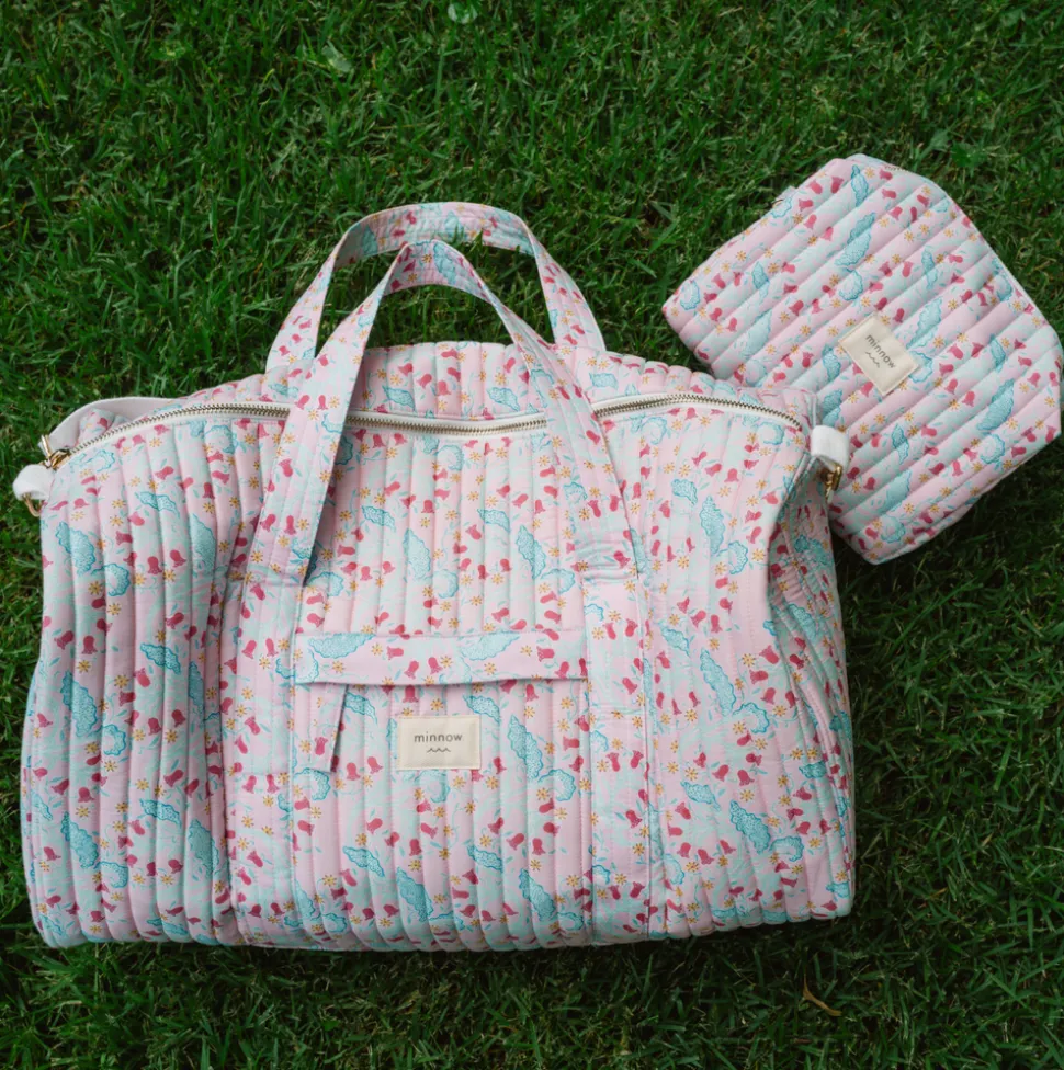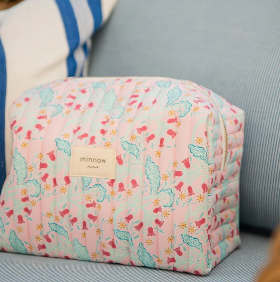 A family favorite for its clean lines and simple details, minnow creates pieces that are playful, polished, and thoughtfully designed for long days, sandy toes, and the wonderment of life on the shore. The Bluebells Interior Coated Travel Pouch is a must-have for your next trip to the beach and pool, or tossed inside a tote for running errands. It is an ideal throw-and-go to help you keep track of all your essentials. Designed in soft quilted fabric featuring an exclusive print designed by artist Ellen Merchant, this bag fits your sunscreen, snacks, phones, keys and other small essentials and will quickly become a staple for all your adventures. Add a monogram for a personalized touch.