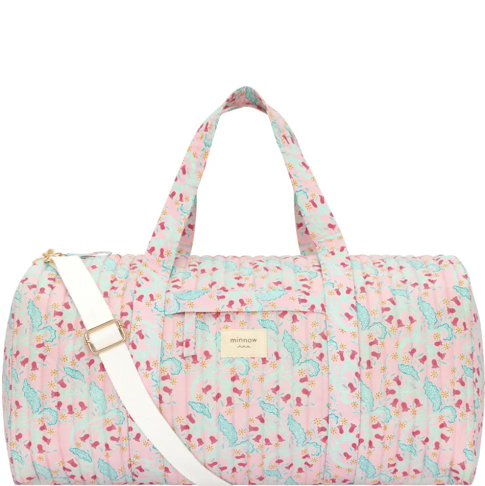 A family favorite for its clean lines and simple details, minnow creates pieces that are playful, polished, and thoughtfully designed for long days, sandy toes, and the wonderment of life on the shore. The Bluebells Quilted Cotton Weekender Bag is your new go-everywhere bag. It is the ideal size, roomy enough for all your essentials, but not overly bulky. With two grab handles and a long shoulder strap, you have plenty of options for carrying it across the sand or the airport. Interior and exterior pockets allow for safe storage of smaller items. Gold zippers and hardware add a touch of sophistication to the tasteful simplicity of our exclusive print designed by artist Ellen Merchant. Make it your own with a personalized monogram.