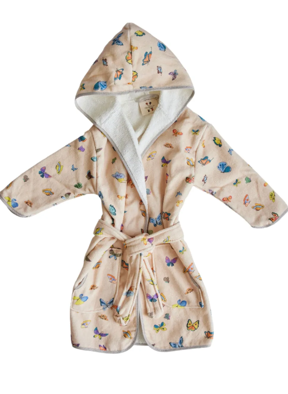 Get super cozy! Made with our ultra soft velour cotton terry and printed with our Madame Butterfly motif on a blush peach background, your little one will want to play, eat and sleep in this robe. We designed sweatshirt-style pockets into this robe to keep little hands warm (or to store their favorite things!), giving it that extra something special.