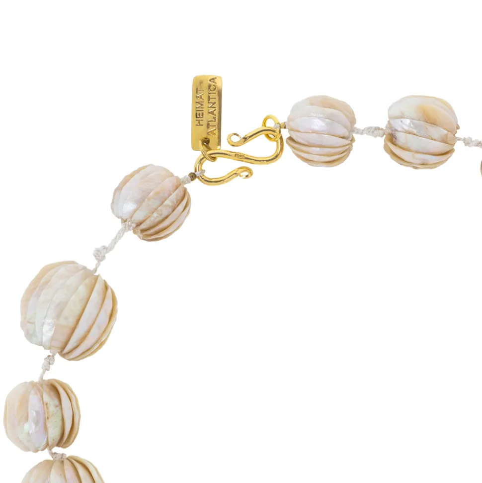Founder Montserrat Álvarez marries the traditional craftsmanship of coastal Spain and Portugal to a modern sensibility with handwoven reeds, local leatherwork, and porcelain fetiches of the brand’s beach-to-city bags and unique accessories. The Bolas Necklace is a luminous testament to heritage and handcraft. Created by José Luis—the last artisan in O Grove preserving the 19th-century technique of transforming seashells into nacre beads—this piece reflects a legacy passed from father to son. Each nacre bead is delicately shaped by hand and strung with 925 sterling silver, gold-plated accents, including a custom tag, ring, and S-hook clasp. A quietly radiant design that captures the spirit of the sea, the Bolas Necklace is offered in a limited release. Pre-order now to reserve one of just 10 new pieces currently in production and ready to ship in 10 days.