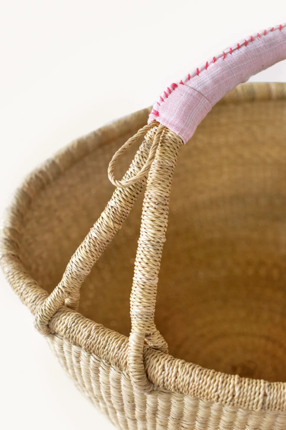 – Made from elephant swamp grass with a cotton fabric handles with pink thread