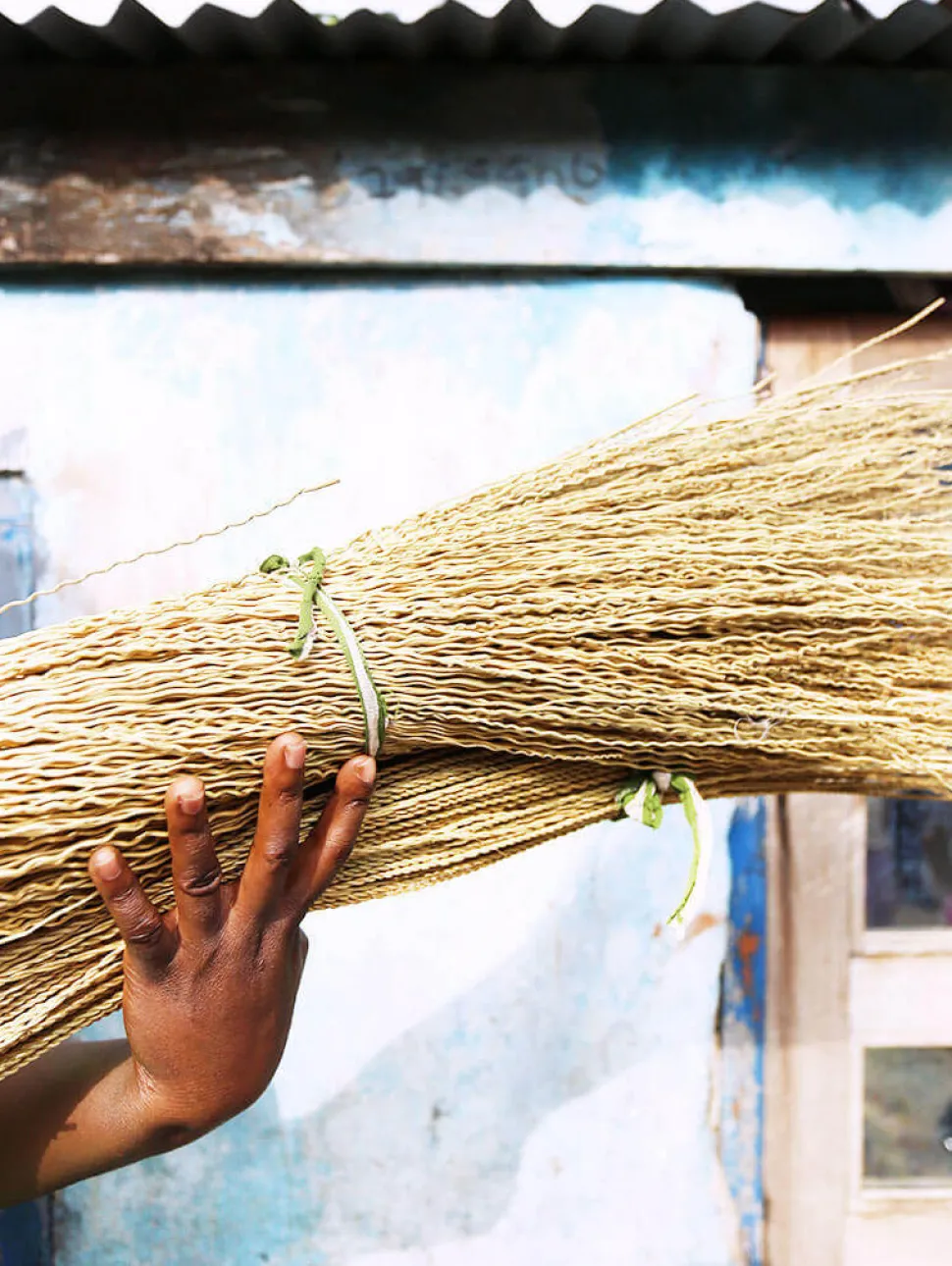 Made from 100% elephant grass, a strong, resilient grass that grows abundantly in Northern Ghana. Before weaving, the grass is prepared by hand-splitting, twisting, and softening with water, a process that takes about a week to complete. Natural color accented with blue, white, and yellow striped handles.
