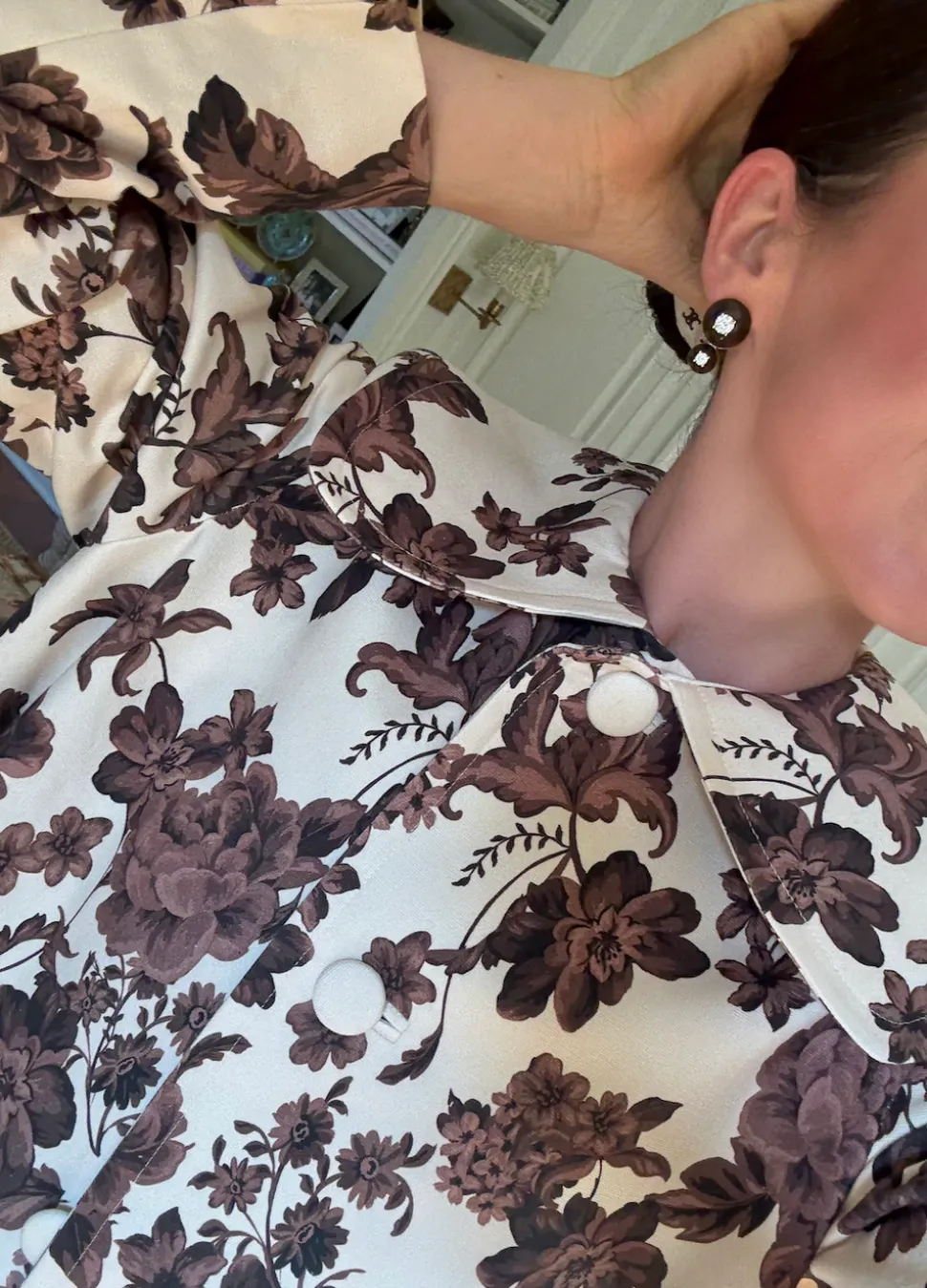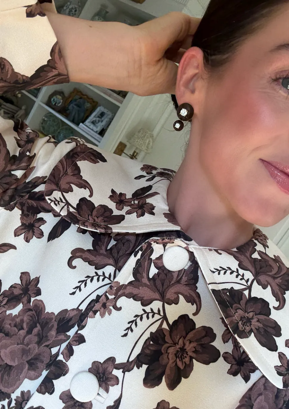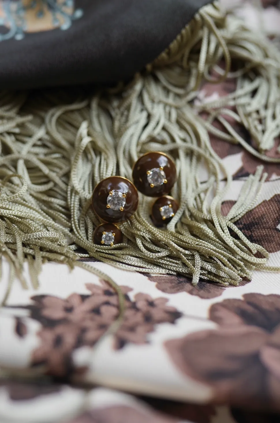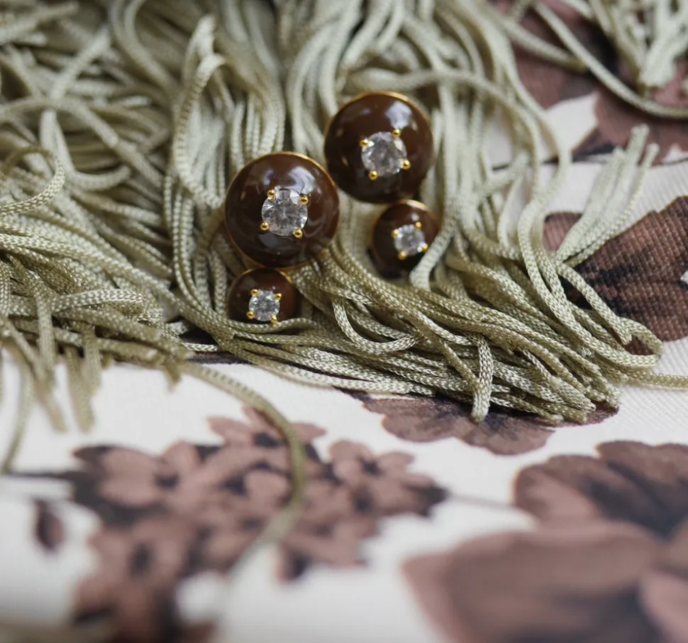 OTM bride Nicola Bathie’s jewelry is a whimsical expression of art and adornment, inspired by her South African roots, her Texas home, and the romance of her travels. Playful yet elegant, the Bonbons Au Chocolat earrings cascade in a strand of gilded sweetness, designed to make a statement with their length and luminous detailing.