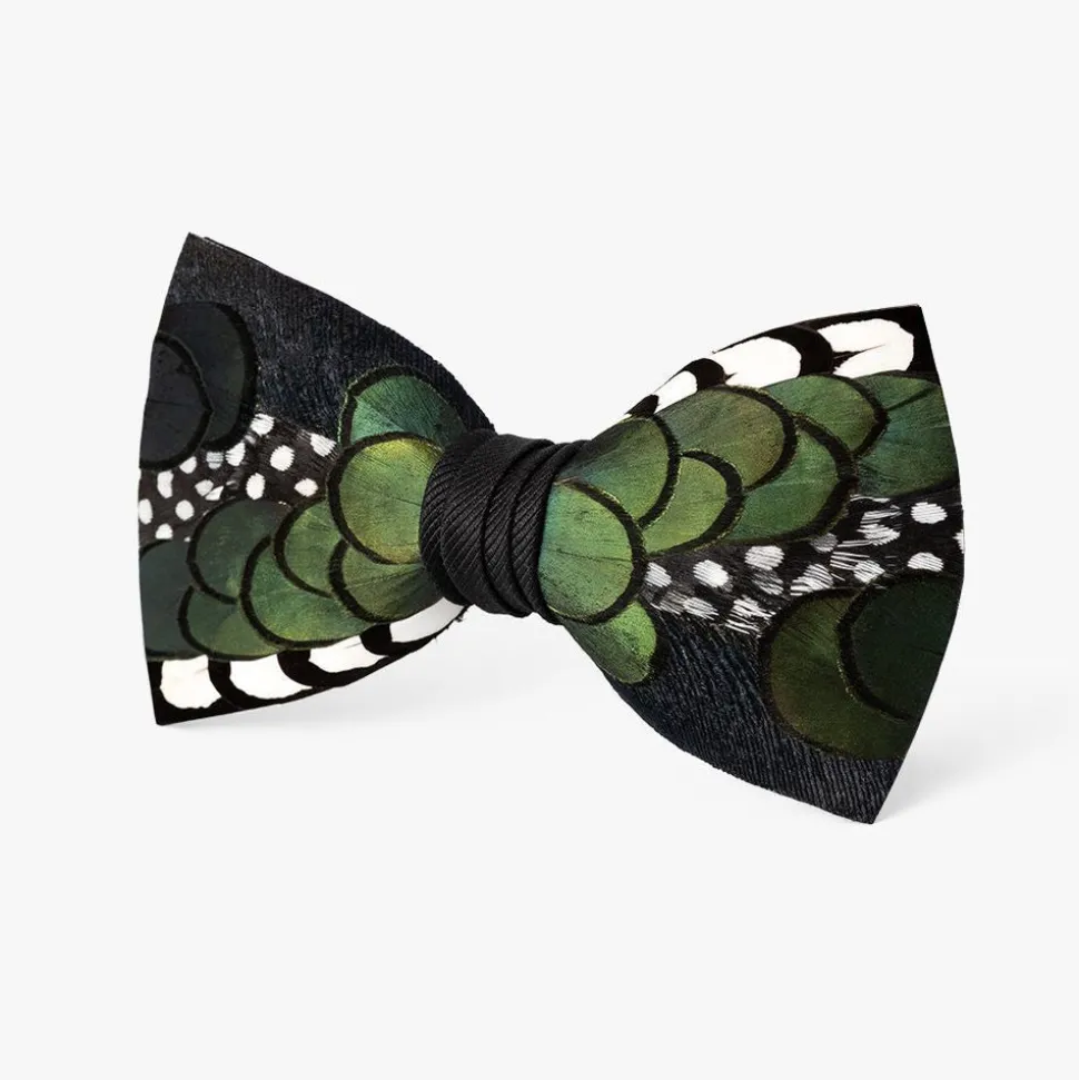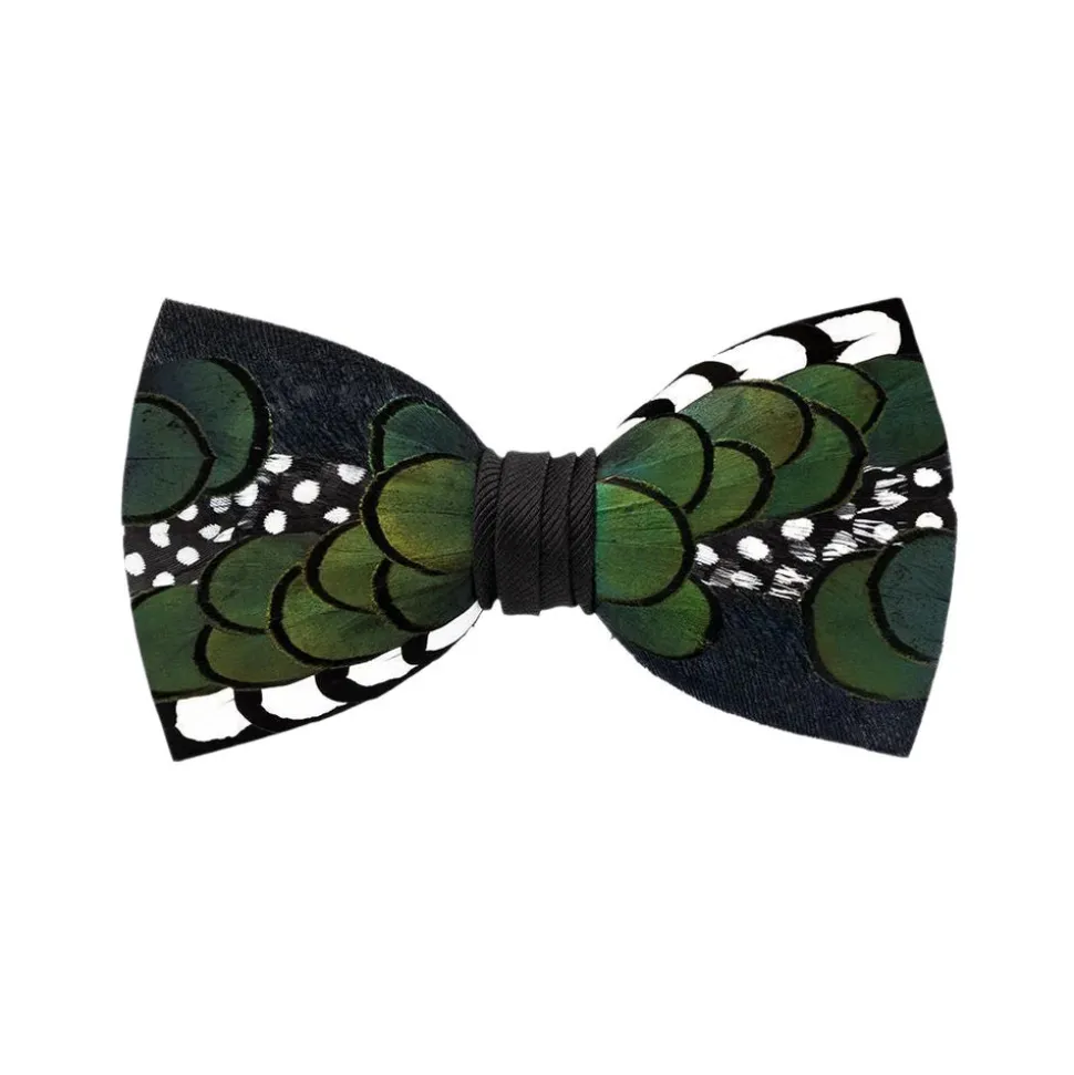 Brackish began with one feather bow tie designed by Ben Ross and gifted to his groomsman, Jeff Plotner. Since its inception, the brand has blossomed into a full line of men’s and women’s accessories designed and handcrafted in Charleston, South Carolina with each piece focused on honoring the beauty found in nature. Handcrafted in Charleston, SC with peacock, pheasant, and guinea feathers, the Bondurant Bow Tie works in both casual and formal settings with its asymmetrically designed green, and black pattern and a sprinkling of polka dots for a bit of fun and flare.