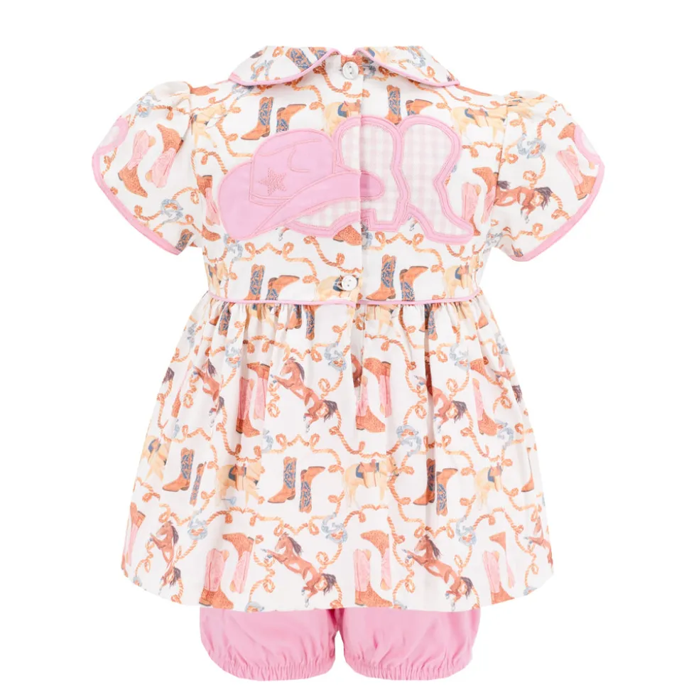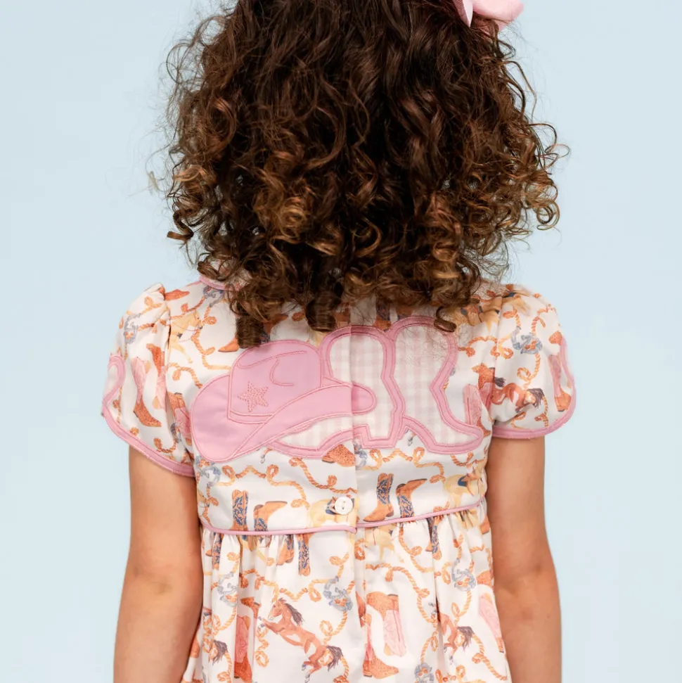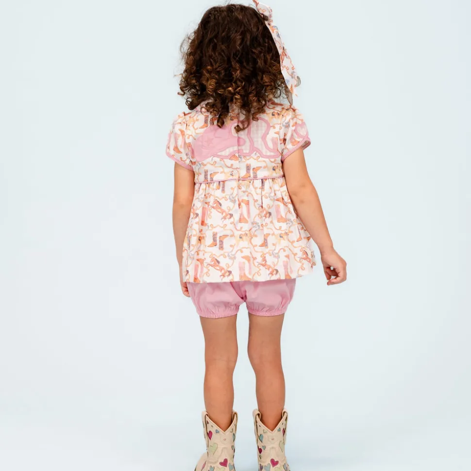 Inspired by the beauty of motherhood, Dondolo is a luxury lifestyle brand that provides beautiful, heirloom-quality clothing for generations to come. Each design is thoughtfully crafted in Colombia with ethical manufacturing, making every piece even more special. The Bonnie Girl Set is a playful nod to country charm, designed for little cowgirls who love to explore in style. This two-piece ensemble pairs a dainty embroidered top with pink gingham shorts, blending softness with spirited detailing. Heart-embroidered sleeves, pink piping at the chest, and an appliqué of boots and a hat on the back make this set a standout choice for sunny days and memory-making moments.