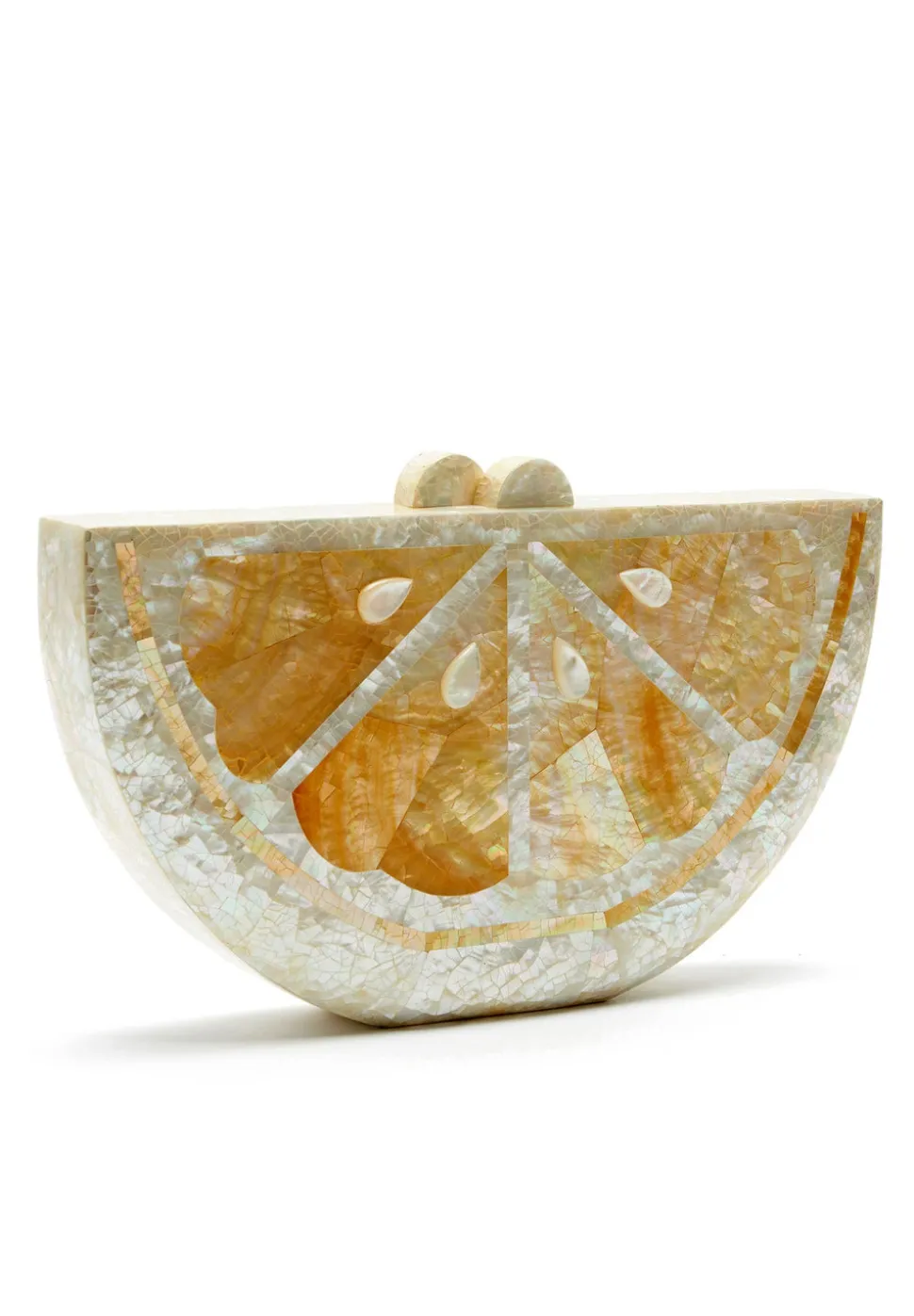 Appreciation for quality materials and strong integrity to design and workmanship are the main principles behind Emm Kuo. Architectural influences, strong textural contrasts, and clean shapes render the entire collection modern yet classic. The Bora Bora Lemon Clutch is a citrus-inspired summer accessory that fits comfortably in the hand. This lemon minaudière is just the right size for any iPhone model.