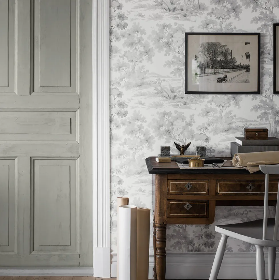 Founded by Frederic Schumacher in 1889 on Fifth Avenue in New York, Schumacher design transcend trends and time with generations-tested unwavering devotion to beauty and quality. Their luxury pillows, fabric, wallpaper, trim, and furniture allow decorators and shoppers alike to create with total confidence. A painterly version of a classic pastoral design brings both calm and modern splendor to any room in the Boråstapeter Countryside Morning Wallpaper in Grey.