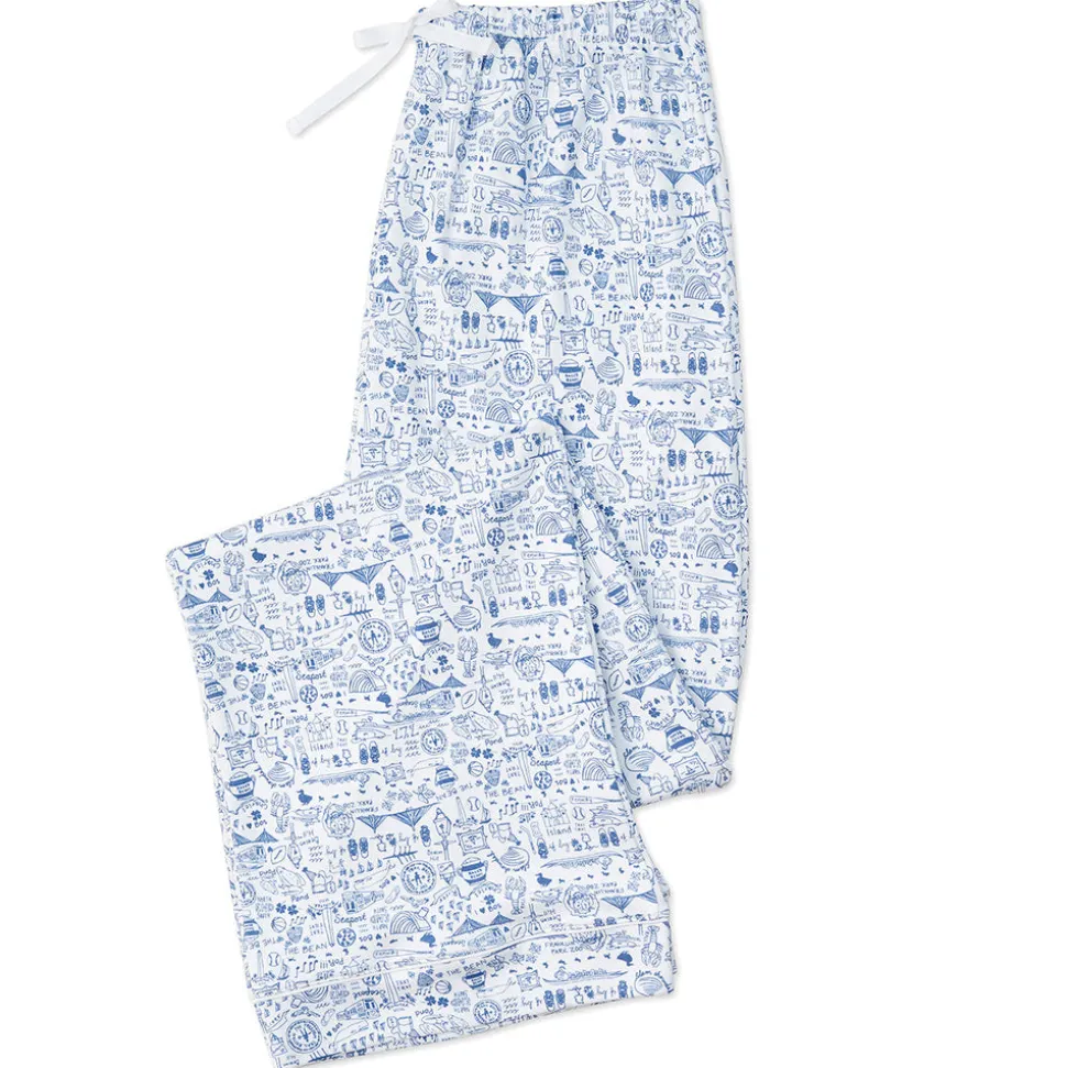 100% Peruvian pima cotton. Hand-drawn print by brand founder. Button front top with collar. Elastic waistband and drawstring.