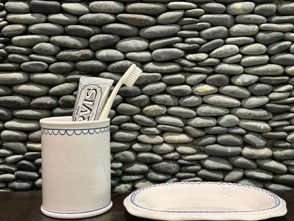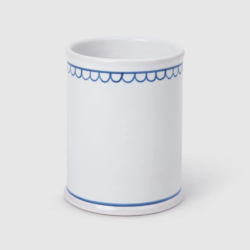 Z.d.G by Zoë de Givenchy’s French-made ceramics, linen, and flatware display refinement above all else. This, and a certain je ne sais quoi, were gleaned from the table of her husband’s uncle, Hubert de Givenchy, the legendary couturier, and one of the century’s finest hosts. The designs breathe new life into master artisan techniques, perfectly showcased in the Les Bleuets capsule collection. This Bouclette Tumbler and Petite Plate set, trimmed in a perfect shade of blue, was created to sit in the bathroom as a chic toothbrush or make-up brush holder and matching soap dish. An excellent gift, or little indulgence to brighten any powder room.