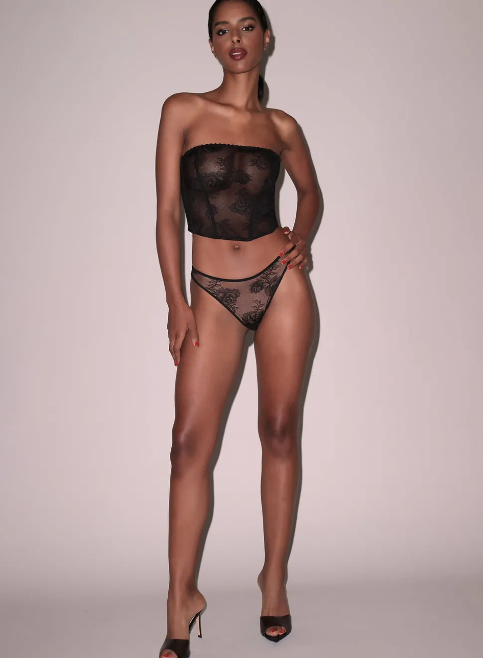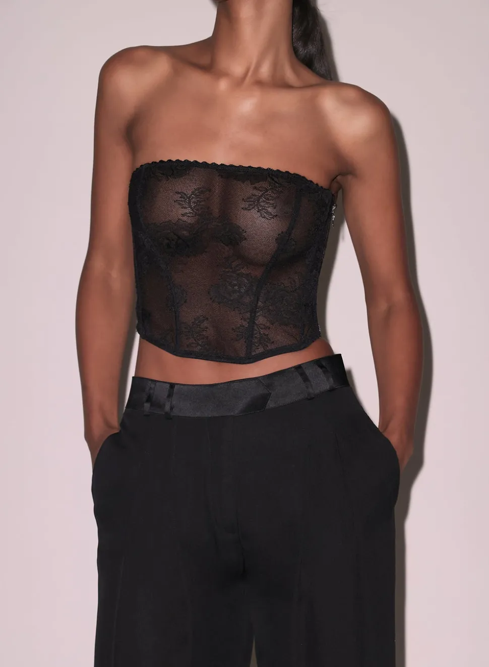 Inspired by Charles Baudelaire’s masterful collection of poetry entitled “Les Fleurs du Mal,” Jennifer Zuccarini founded Fleur du Mal with the belief that wearing beautiful lingerie should be an everyday affair. Tastefully provocative, the luxury brand has amassed a cult following of devotees who adore the sultry and empowering pieces. The Bouquet Lace Corset Top boasts a super soft stretch floral lace. Lined in mesh for semi-sheer look, with soft boning to give shape and flatter the figure. Pair it with the matching black Bouquet Lace Cheeky.