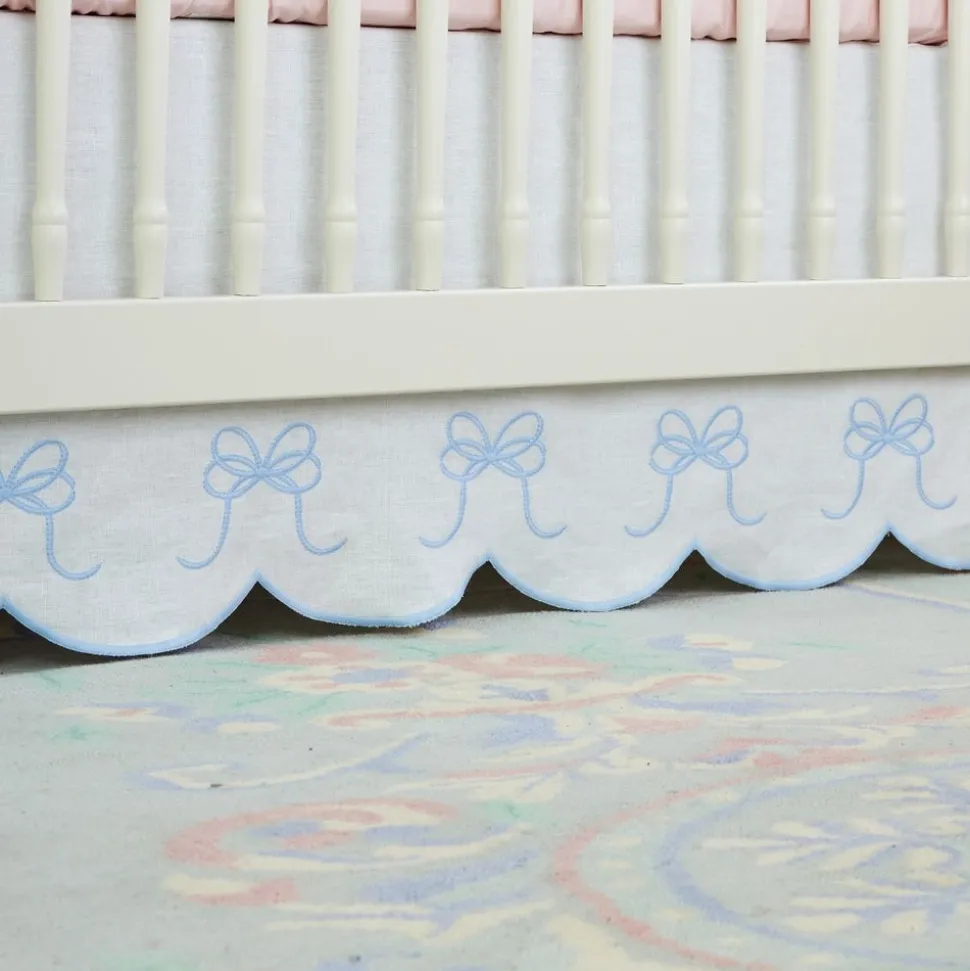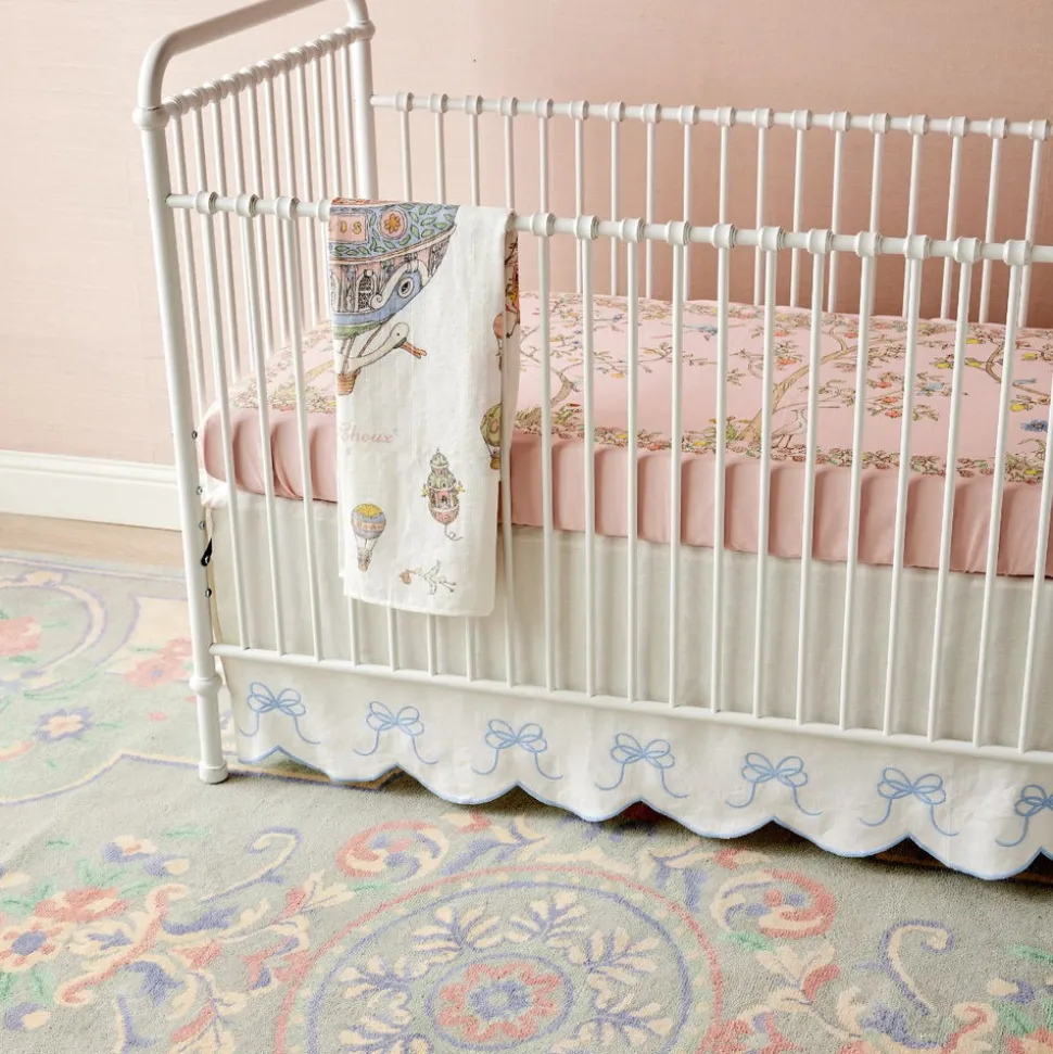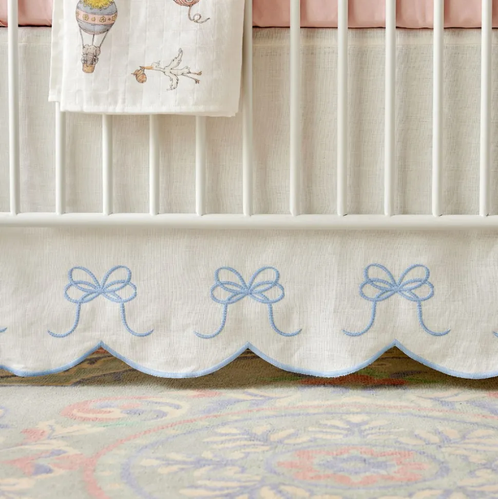 Founded on timeless design principles, Caitlin Wilson Design blends sophistication and uniqueness, embracing a variety of styles. The brand features textiles ranging from antique-inspired Persian rugs to custom pillows, wallpaper, lighting, furniture, and more. With a focus on pattern and color, Caitlin Wilson Design creates distinctive, signature interiors that bring out the full potential of every space. The best-selling Scallop Crib Skirt now with a sweet embroidered bow detail in the signature Soft Blue. The Bow Scalloped Crib Skirt in Soft Blue will add femininity and charm to your infant’s nursery. Its soft blush edge, delicate linen fabric with embroidered bow details allow it to pair beautifully with the Cait Kids floral patterns and more.