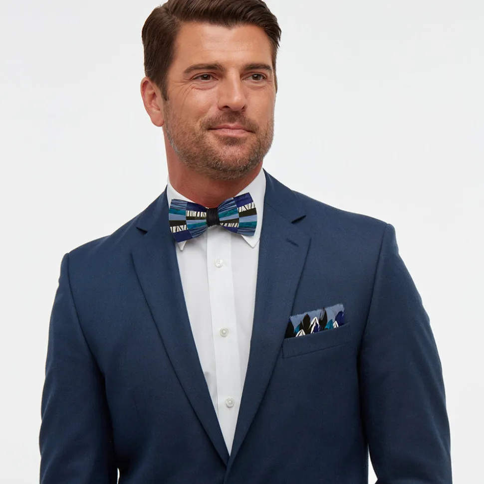 Brackish began with one feather bow tie designed by Ben Ross and gifted to his groomsman, Jeff Plotner. Since its inception, the brand has blossomed into a full line of men’s and women’s accessories designed and handcrafted in Charleston, South Carolina with each piece focused on honoring the beauty found in nature. The Bowie Pocket Square features an intricately layered design of hand-trimmed feathers to create a one-of-a-kind pattern. Crafted using a variety of blue peacock, rooster, and turkey feathers with accents of white pheasant to make a bold, beautiful statement.