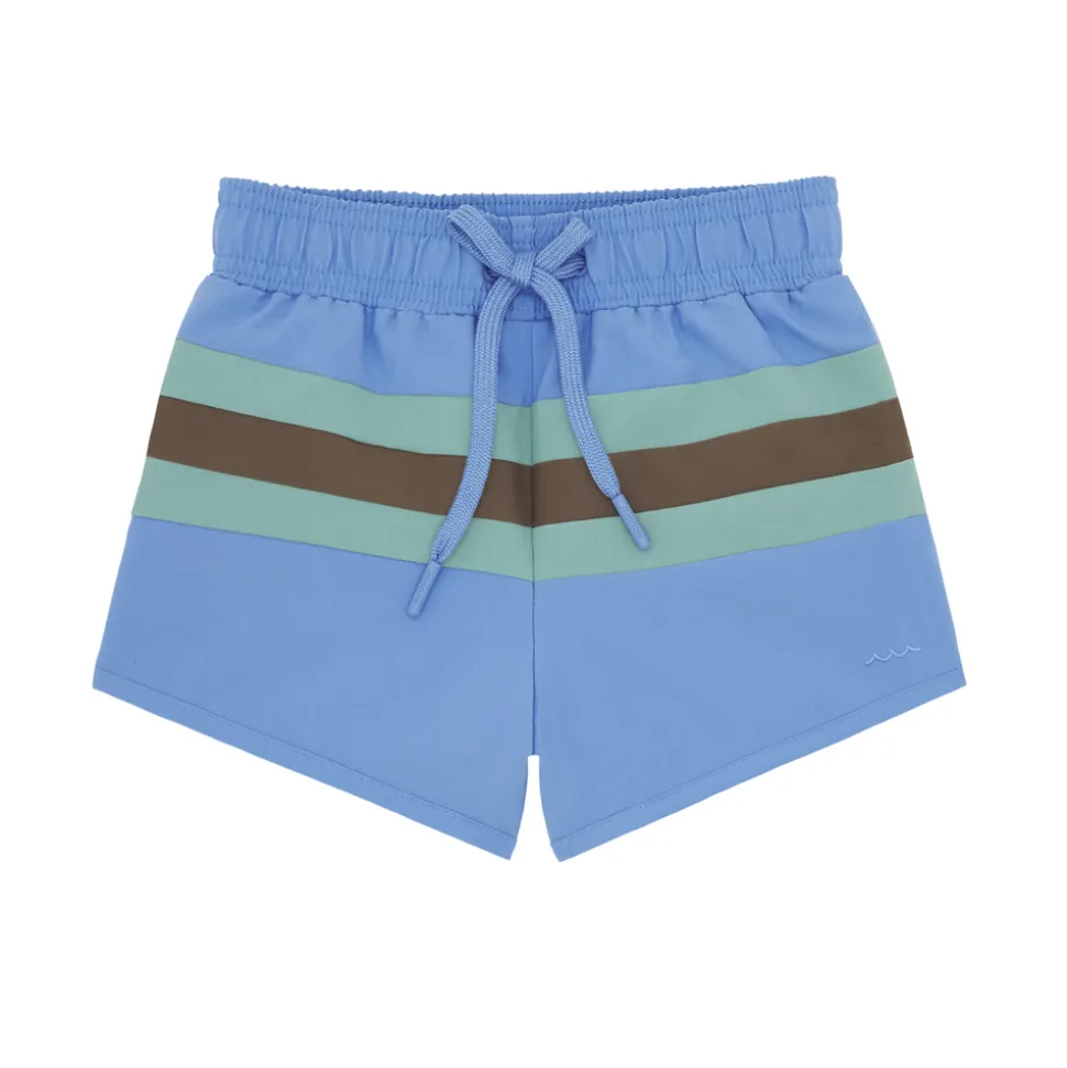 A family favorite for its clean lines and simple details, minnow creates pieces that are playful, polished, and thoughtfully designed for long days, sandy toes, and the wonderment of life on the shore. The Boys Lagoon Blue Triple Colorblock Boardie hit the ideal length for style and function. The new inside stretch liner adds to the comfort and mobility, with a drawstring cord and elastic waistband—perfect for any activity. Pair with a rashguard for all-day fun in the sun.