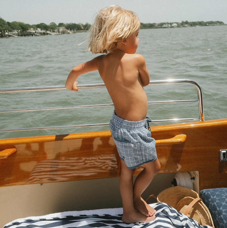A family favorite for its clean lines and simple details, minnow creates pieces that are playful, polished, and thoughtfully designed for long days, sandy toes, and the wonderment of life on the shore. Part of the Minnow x Over the Moon capsule, the Boy’s Newport Navy Gingham Boardie is a best-selling style updated with a soft stretch liner for added comfort. With its tailored above-the-knee cut, elastic waistband, and drawstring tie, it’s a go-to for all-day play in and out of the water.