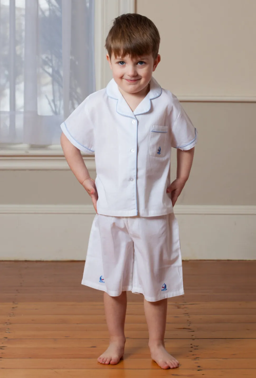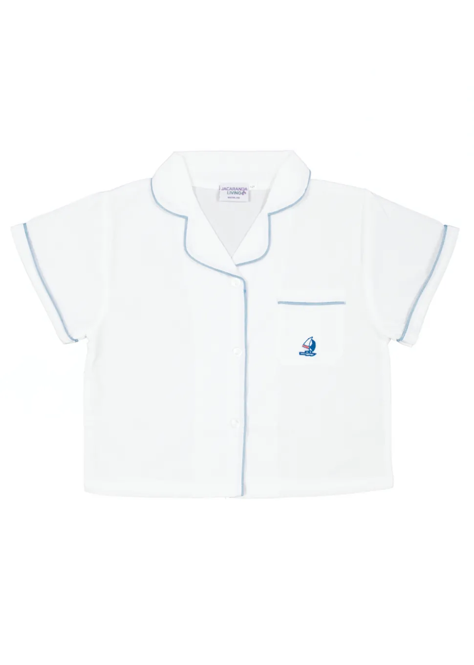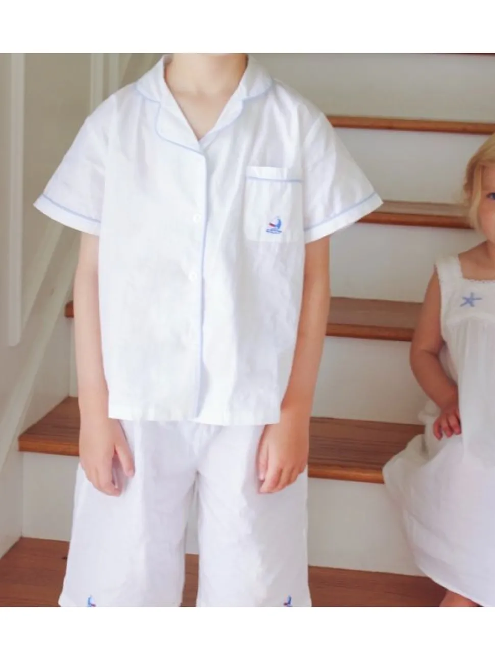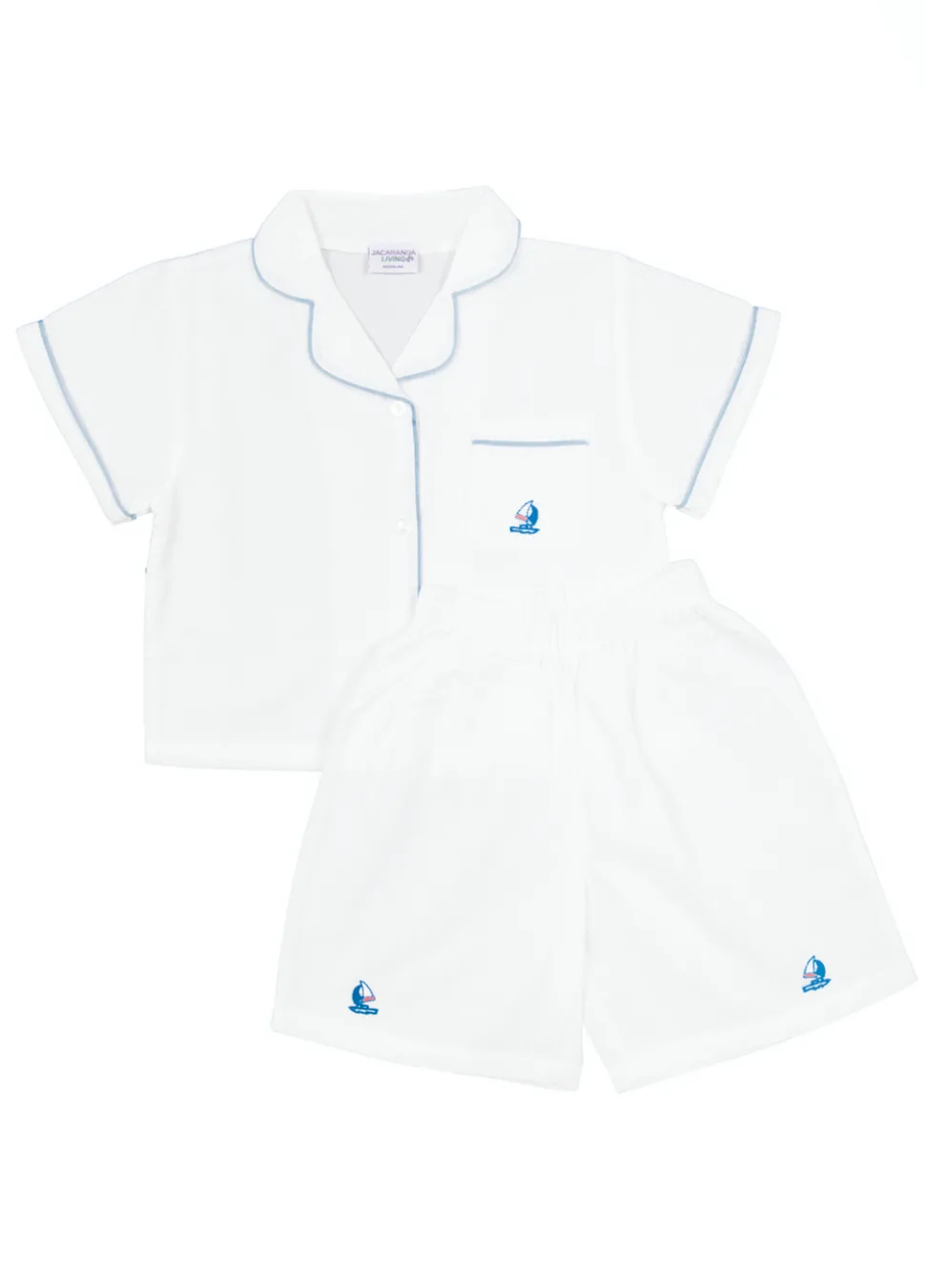 Embracing a European aesthetic of hand embroidery with elegant touches of cotton lace, Jacaranda Living produces a wide variety of high quality luxury linens—for bath, table, sleepwear, and more that feel as good as they look in your home or wardrobe. The Boys Ship Shape Short Set with Sailboat, with its Bermuda shorts and embroidered sailboat design, will quickly be a warm-weather favorite, for the beach or the backyard. This set can be monogrammed above the pocket.