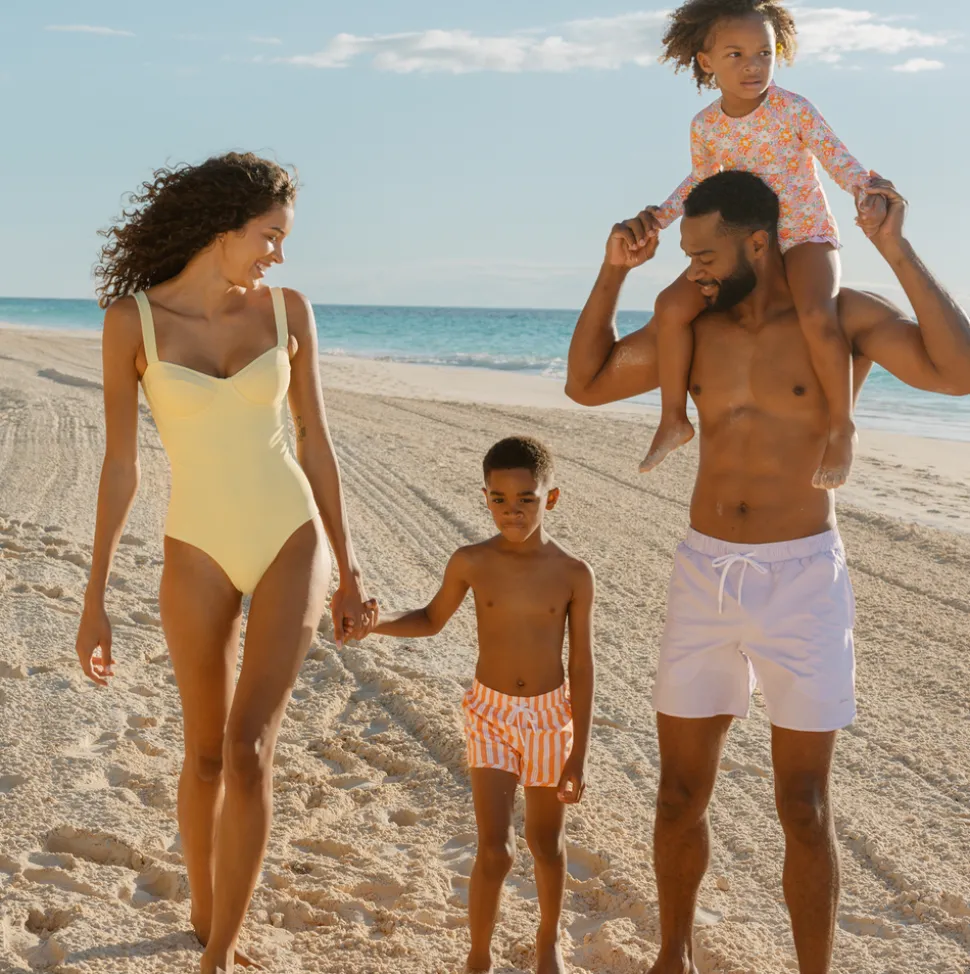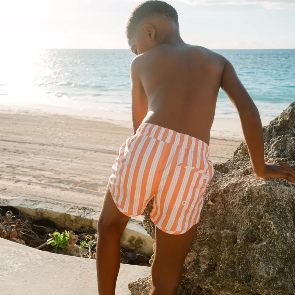 A family favorite for its clean lines and simple details, minnow creates pieces that are playful, polished, and thoughtfully designed for long days, sandy toes, and the wonderment of life on the shore. The Boys Swizzle Stripe Boardie hits at the ideal length for style and function. The new inside stretch liner adds to the comfort and mobility, with a drawstring cord and elastic waistband—perfect for any activity. Pair with the UPF 50+ rashguard for all-day fun in the sun.