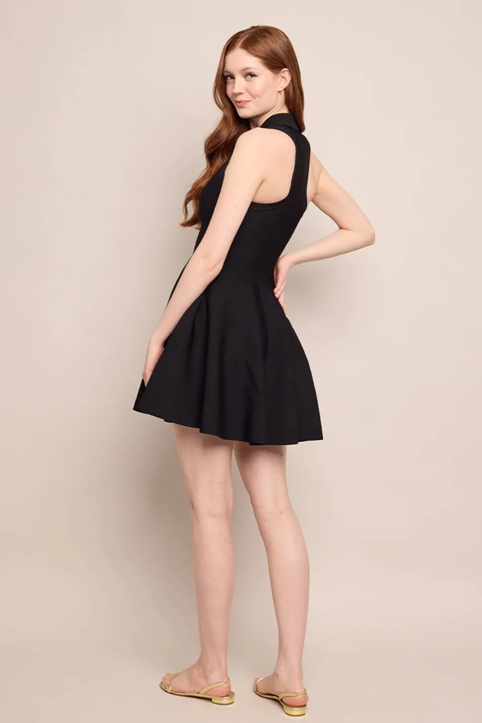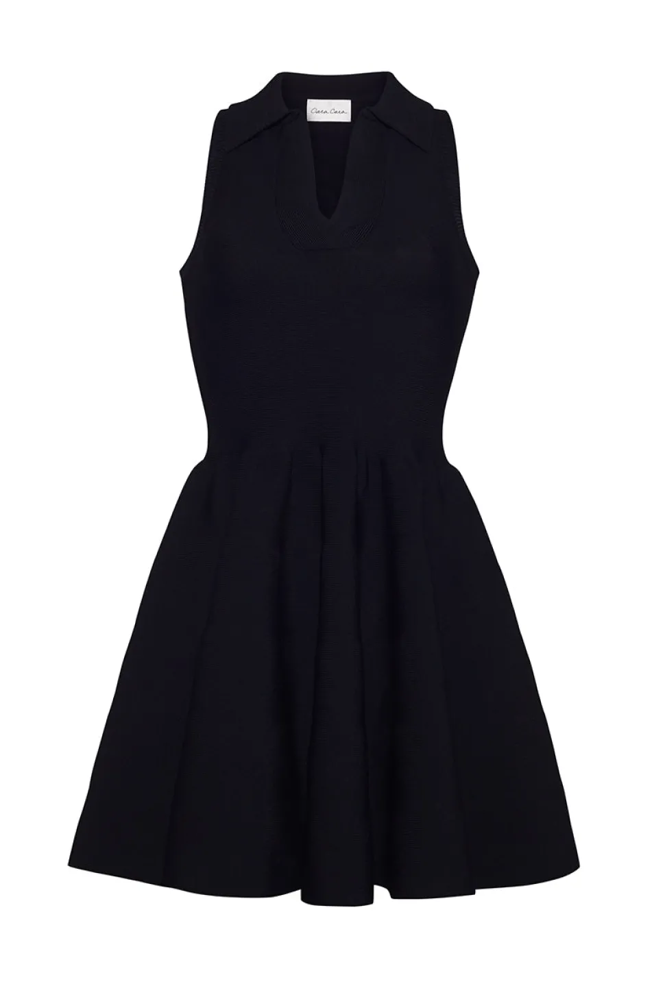 83% viscose, 17% poly. Collared sleeveless fit and flare mini dress. Flared skirt. Razor back. Slick knit.