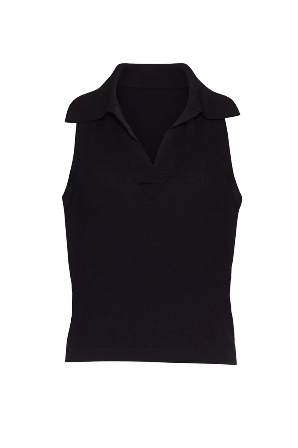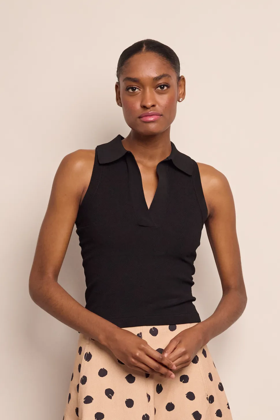 83% viscose, 17% poly + spandex. Collared sleeveless fit and flare fitted top. Racerback. Slick knit. Novelty piqué.