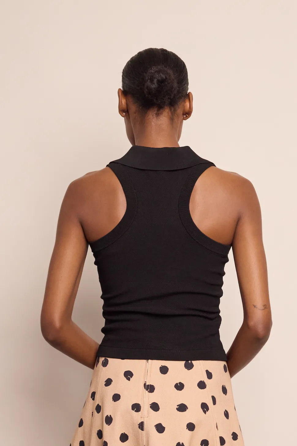 Founded by three New York City-based mothers who met through their kids, Cara Cara’s hallmarks include crisp poplin, house-designed prints, and casual glamour. The inspiration for their ethical womenswear comes from interior design, as well as the world’s most exotic locales. The Braylee Top in Black is a sleeveless fit-and-flare fitted racerback. Sporty and sleek, it has a chic novelty piqué.