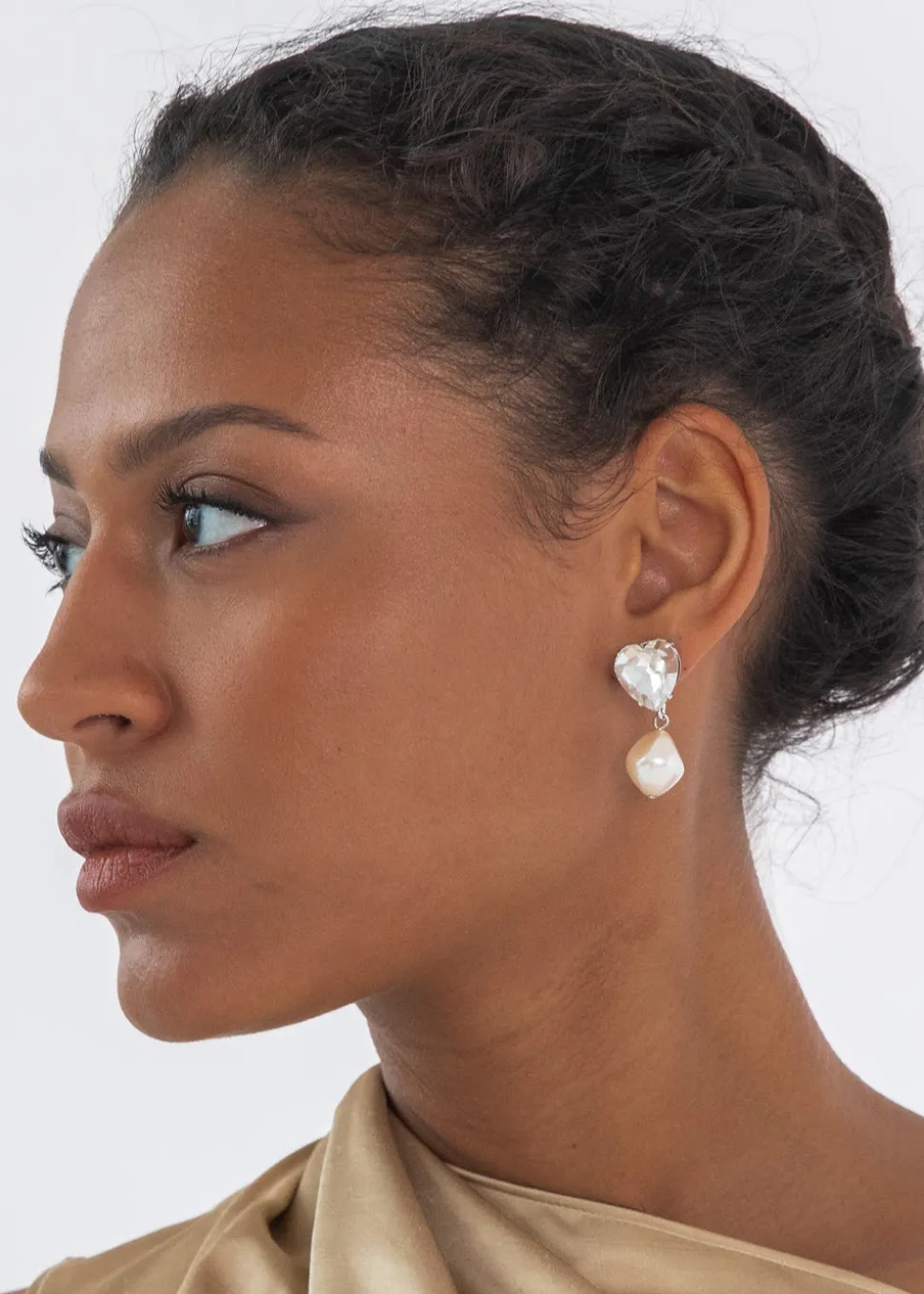 “Everything has a story to tell,” says Jennifer Behr, the founder of her namesake luxury hair accessory brand that has blossomed into one of New York City’s foremost ateliers for jewelry, as well as bridal. In every crystal, pearl, and ribbon, you’ll find the utmost quality and a sense of romance, as each piece reveals a modern interpretation of centuries-old regalia. The Brennan Earrings in Crystal feature unusual heart-shaped crystals, for a look that’s equal-parts sweet and elegant. Baroque-style pearls are suspended like glowing orbs, offering a flattering glow. These drop earrings are elegantly sized to enliven any look, while remaining understated enough to wear with other accessories.