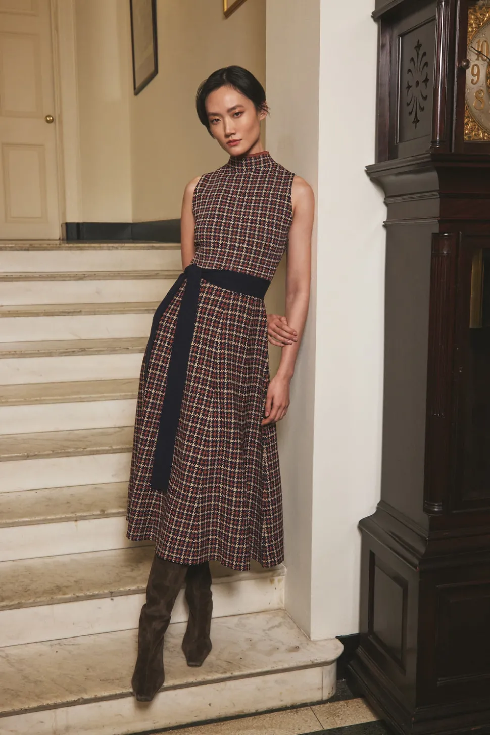 Mini-length fit-and-flare dress in navy check cotton blend. Fitted bodice with structured waist and flared skirt. Concealed back zipper with hook-and-eye closure. Fully lined.