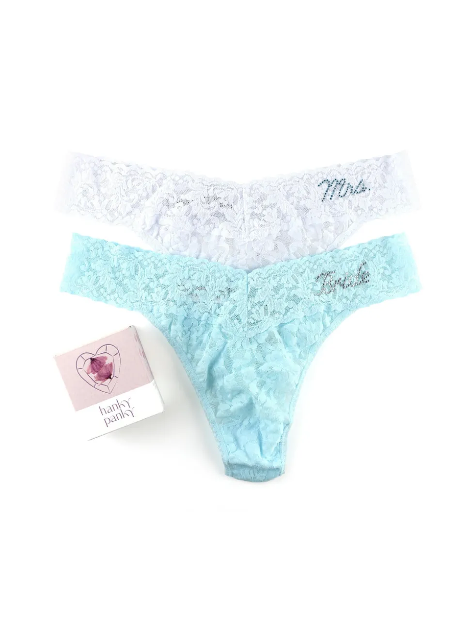 Hanky Panky’s signature V-front and V-back waistband revolutionized the world of lingerie 30 years ago and has put an end to panty lines. Soft and stretchy, Hanky Panky officially makes the World’s Most Comfortable Thong. Fitting low on the hips and easily transported, the Original Rise Thong gets a wedding night upgrade with “Bride” embellishment on the waistband. A lovely, sexy blend of lace, cheek, and your featured title in “something blue” crystals.