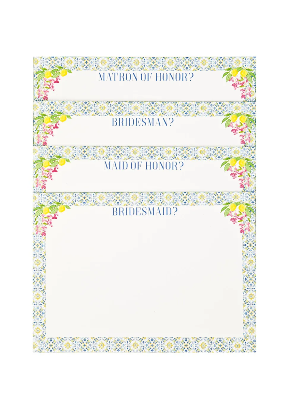 Based in D.C., artist LouLou Baker’s whimsical world—paper products and stationery, home wares, baby clothes, as well as custom linens—will capture your imagination add artful touches to any space. Adorned with a vibrant green mosaic print, the Bridesmaid Cards beautifully pop the question to your closest friends. Whoever you choose to address these exquisite letters to will surely say, “Yes!” Each set of 10 contains 1 matron of honor, 1 maid of honor, 1 bridesman, 1 blank, and 6 bridesmaids cards.