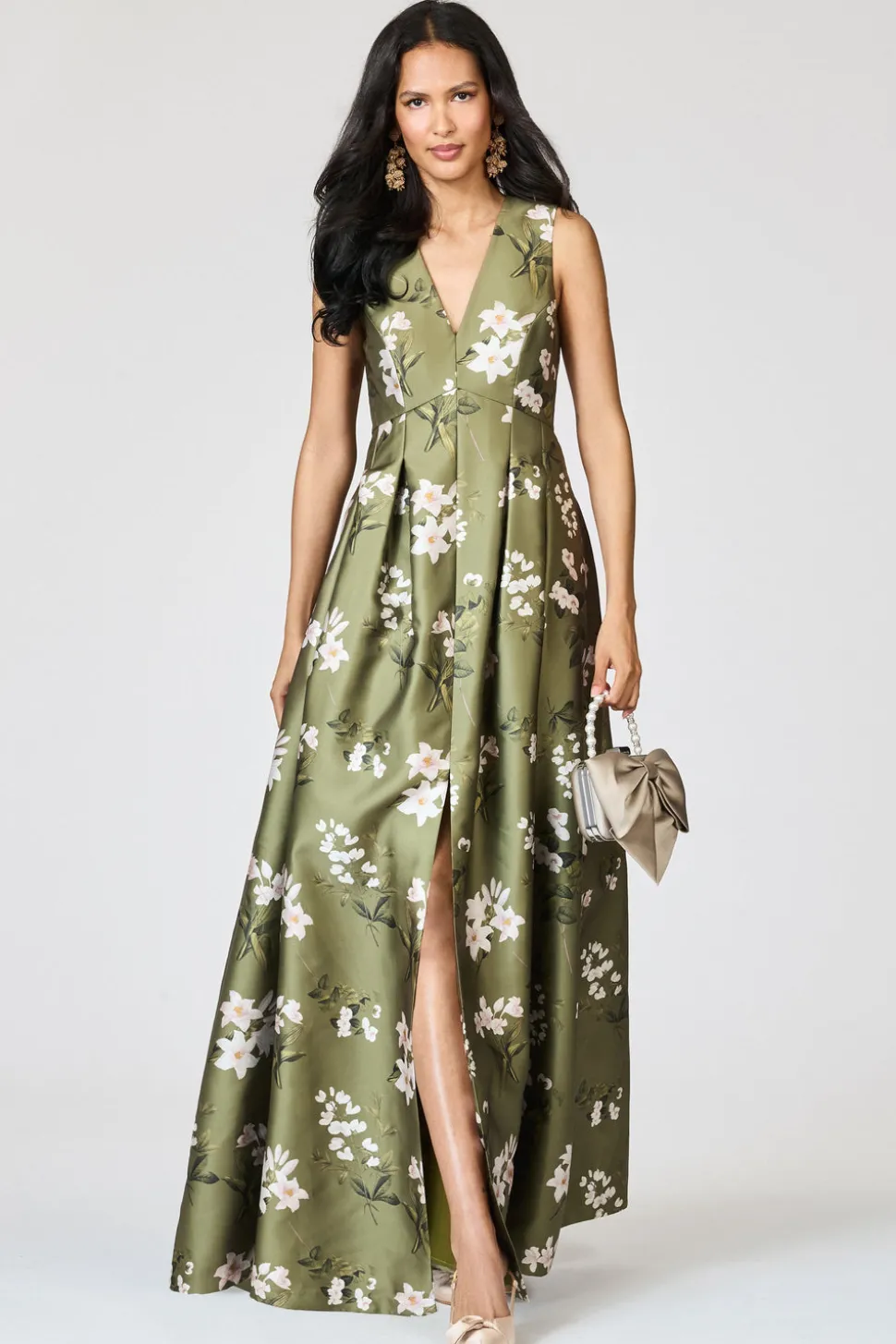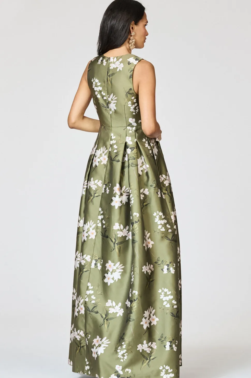 Born in India, Sachin and Babi bonded at New York’s Fashion Institute of Technology and launched an embroidery business, working with top houses, like Oscar de la Renta and Manolo Blahnik. Today, the brand works with their own factory in Mumbai, controlling quality at every stage, and producing womenswear that is at once unique, beautiful, and wearable. The Brooke Gown in Moss Formosa is a classic Sachin & Babi silhouette, designed in printed mikado with a V-neckline, peaked waist, and box-pleated skirt. Side pockets and a front slit add ease and movement, making it ideal for formal celebrations and special occasions.