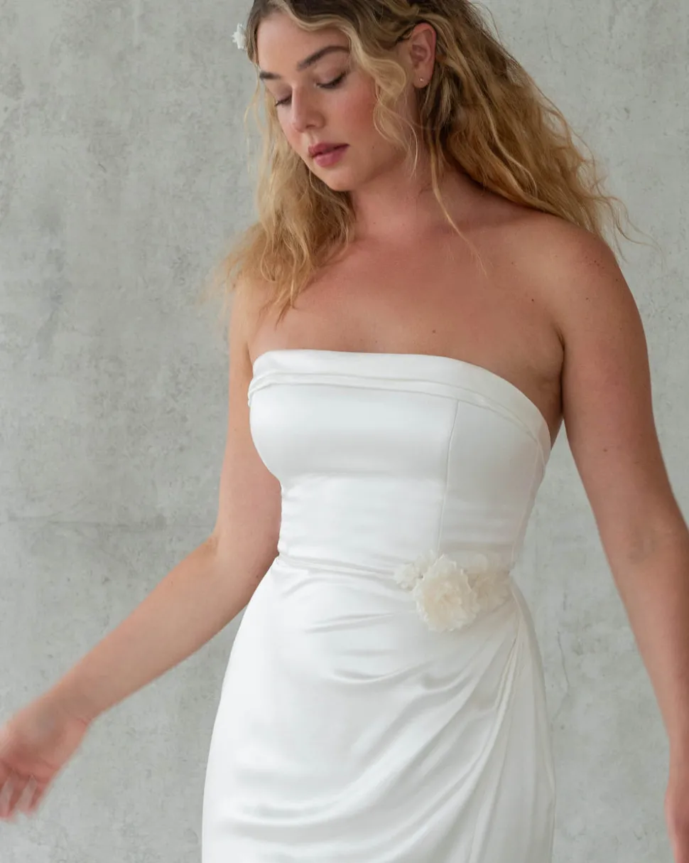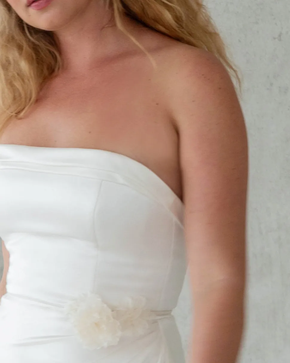 Famed for their comfort and wearability, Alexandra Grecco’s gowns and accessories find the balance between what is stylish and what is timeless. Handmade in New York’s garment district, these pieces embrace refinement and luxury from their graceful silhouettes to each immaculate detail. A trio of silk flowers are clustered on a half inch silk satin ribbon making the Brooklyn Belt—long enough to tie in any style you choose—an ideal finishing touch to any classic crepe or minimally embellished gown.
