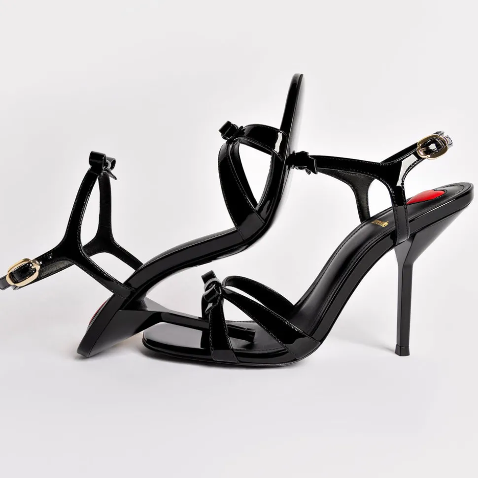 Patent leather. Open round toe. Adjustable ankle strap. Bow detail. High heel Insole with memory foam cushion and hot stamp logo. Handmade in Brazil.