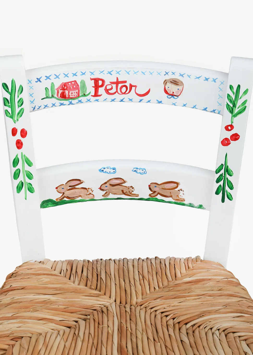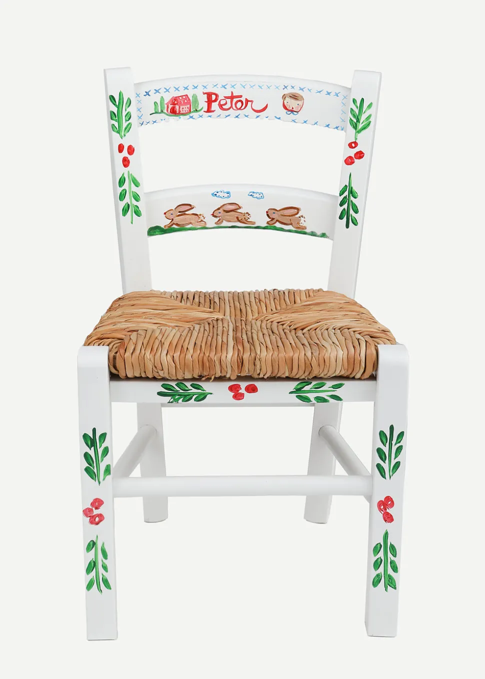 Hand-painted ceramic. Wooden chair with a woven rush seat. Handmade in the USA.