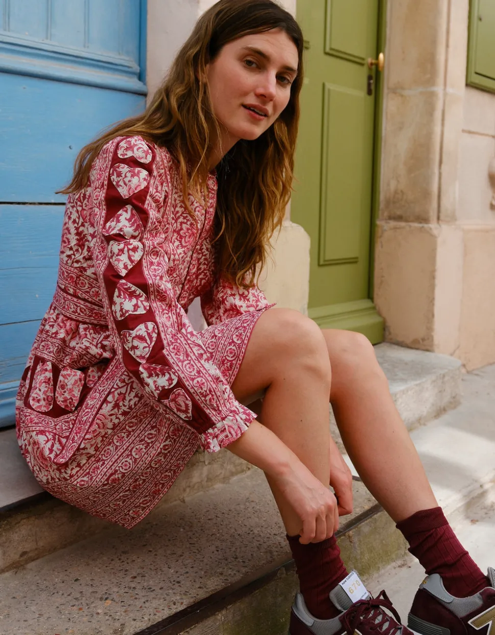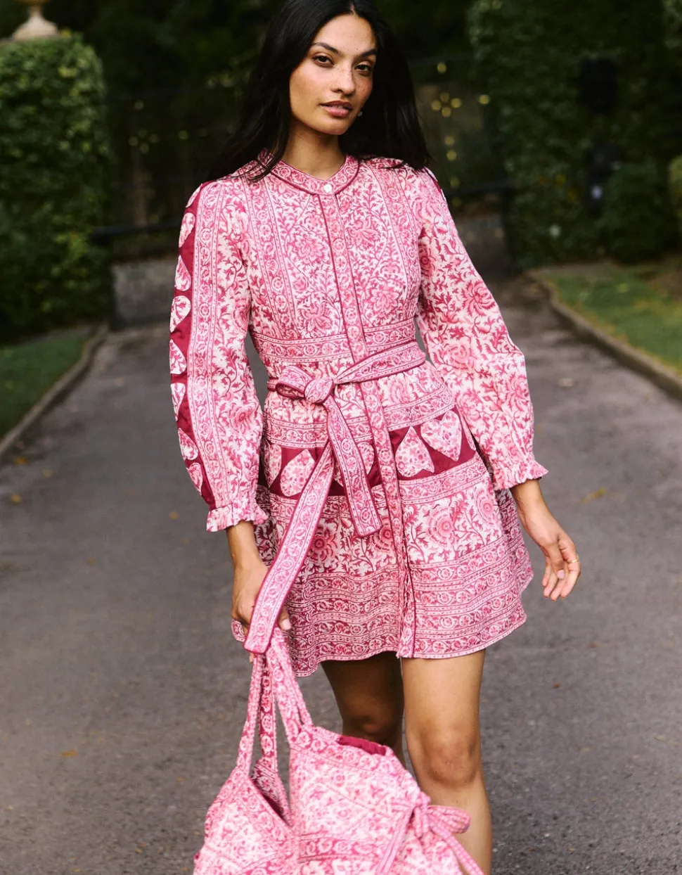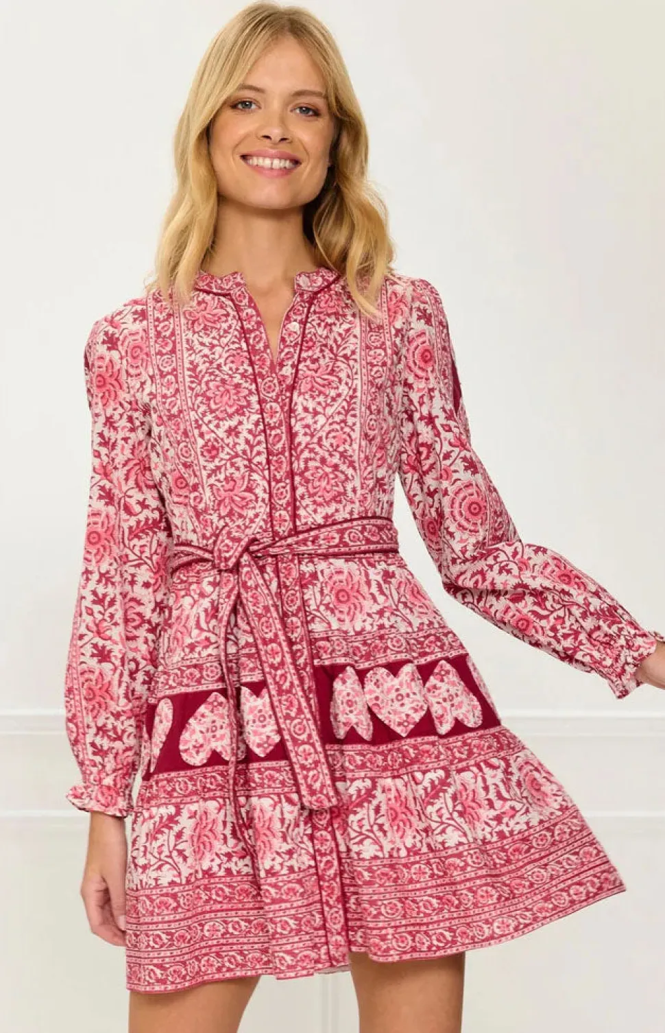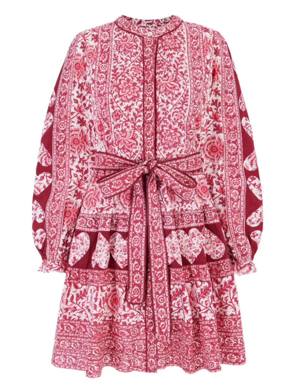 Color and creativity are the foundations of Pink City Prints, a brand inspired by founder Molly Russell’s life in Jaipur. In her inimitable dresses, you’ll find centuries of craft knowledge, expressed through unmatched quality and traditional techniques, like hand embroidery, block printing, and hand-looming. A playful twist on a bestselling silhouette, the Burgundy Patchwork Gemma Mini is crafted in rich shades of pink and burgundy, featuring a stunning hand block-printed floral design. Full-length sleeves are finished with delicate appliqué heart embroidery for a romantic touch. With a flattering tiered mini skirt, ruffled collar, and matching belt, it’s a joy to wear. Style with or without the belt and pair with knee-high boots for a polished look.