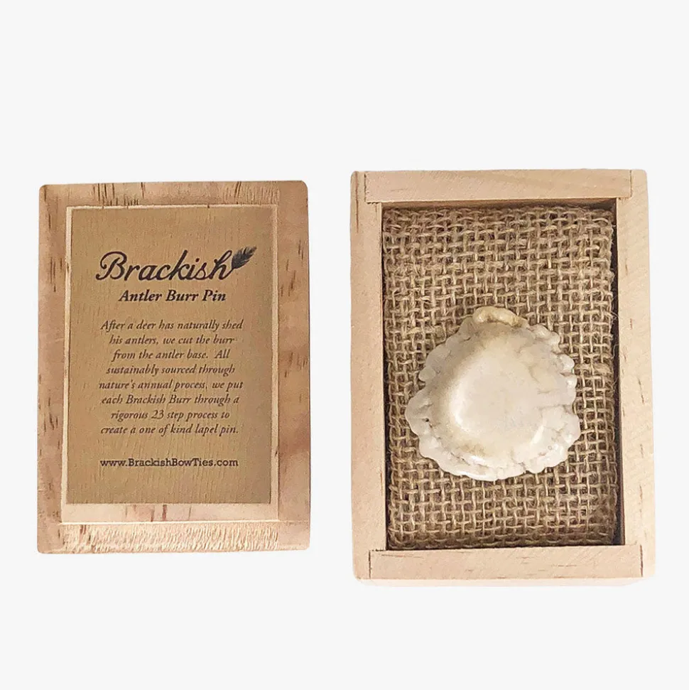 Brackish began with one feather bow tie designed by Ben Ross and gifted to his groomsman, Jeff Plotner. Since its inception, the brand has blossomed into a full line of men’s and women’s accessories designed and handcrafted in Charleston, South Carolina with each piece focused on honoring the beauty found in nature. The Burr Pin is made from the base of deer’s naturally shed antlers and makes for a great conversation piece. The antler burr is put through a 30 day process until it becomes the shiny new addition to your favorite jacket.