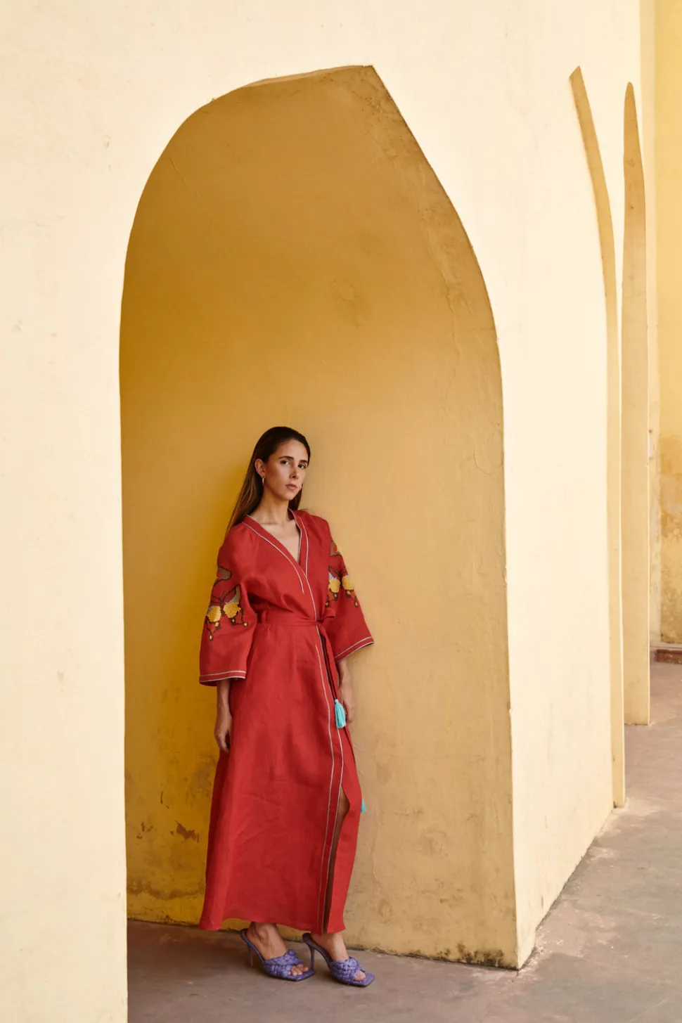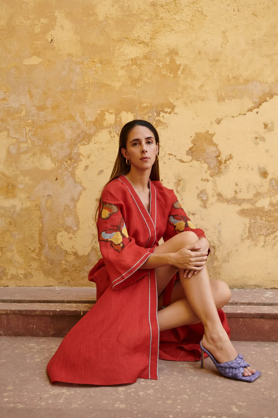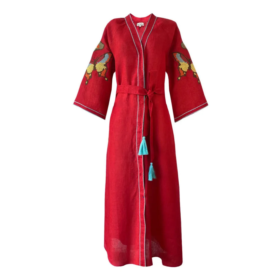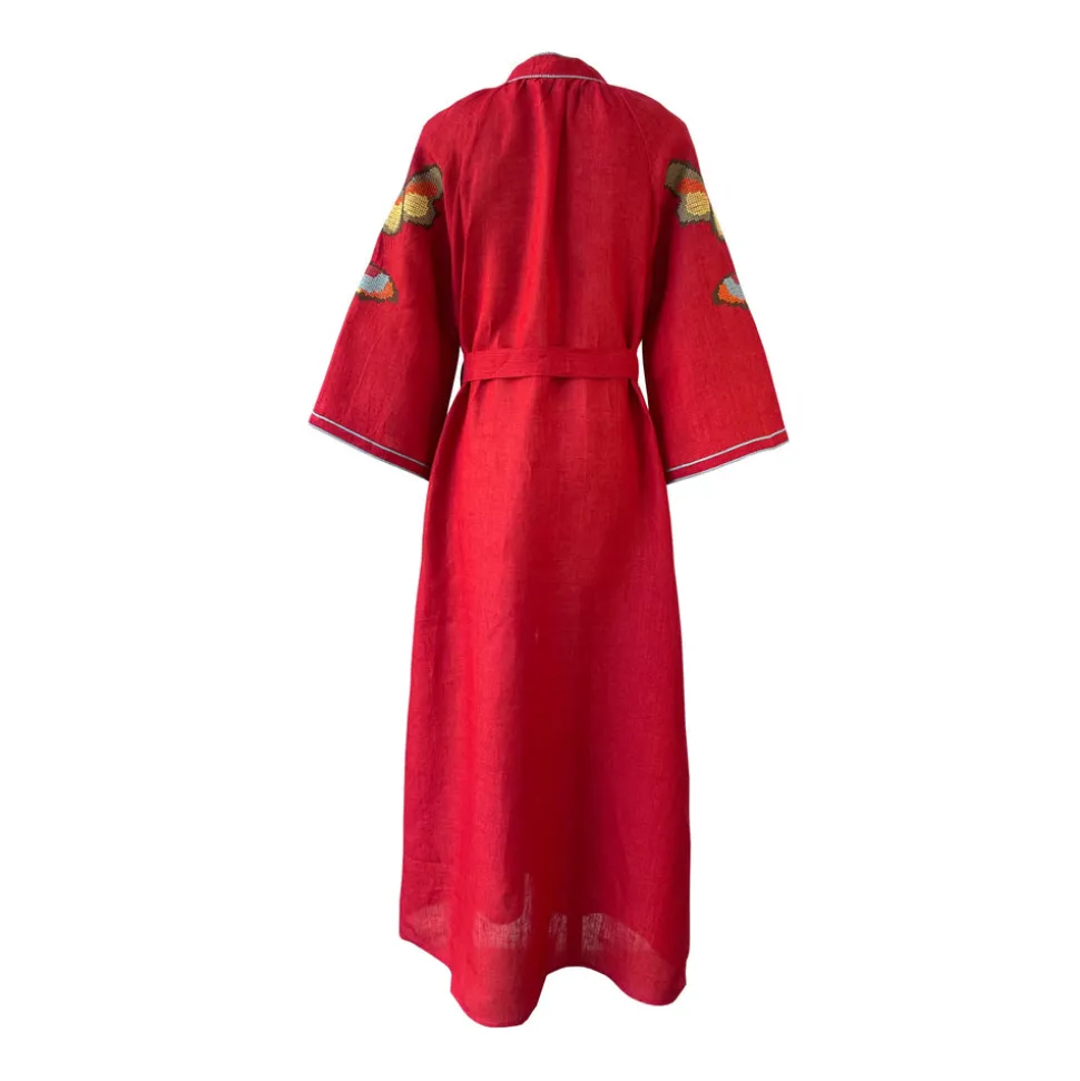 De Castro showcases a seamless and unique blend of traditional Indian craftsmanship, contemporary design, and the founder’s Colombian heritage. Every piece is handmade by artisans, using time-honored techniques and the finest cotton and silk fibers, resulting in exceptional quality, sustainability, and style. The Butterfly Dress is made of linen from the South of India. This kaftan-style dress in red color features butterfly cross-stitched embroidery, raglan bell sleeves, hidden front buttons, and tasseled belt.