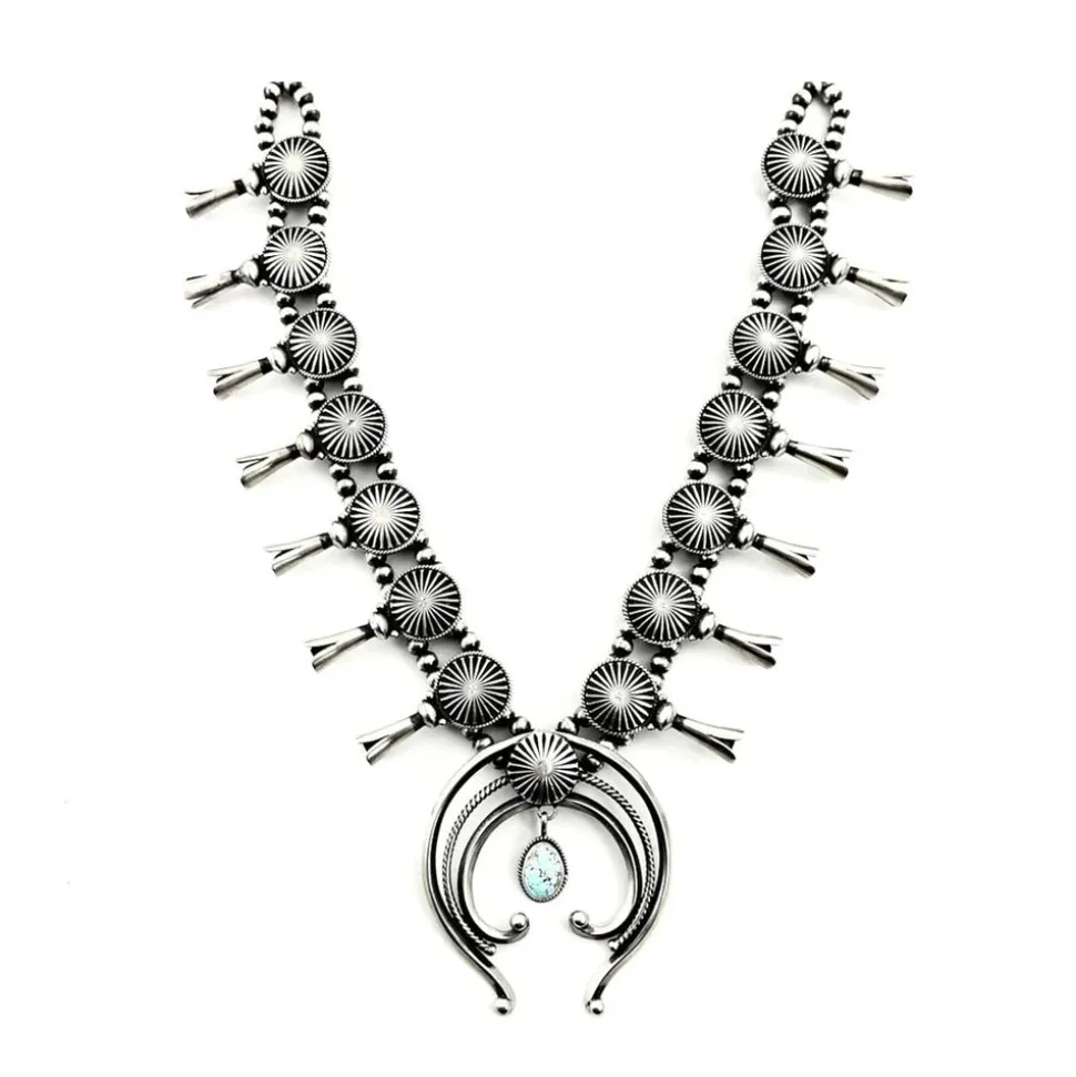 Through ethical sourcing and philanthropic giving, Vicki Turbeville’s collections showcase the finest handcrafted Native American jewelry. With longstanding relationships with artists and dealers across Native American communities, the brand remains steadfast in its support of First Nations peoples. Dedicated to transparency, Vicki Turbeville ensures best practices in provenance, identification, and authentication of all jewelry pieces. Handmade by Navajo artist Derrick Gordon, this necklace features hand-fluted button design and a Number Eight turquoise pendant.