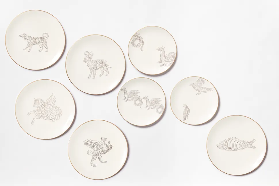 Founded by Costanza Paravicini, and taking inspiration from the classic tradition of fine Italian pottery, Laboratorio Paravicini seeks to create handmade tableware and plates as they were in long ago, but made today, for everyday use. Using a decoration technique called Gran Fuoco sulla Terraglia Bianca, the patterns under glaze emerge as uniquely bright and durable. In a testament to the romantic modes of travel from yesteryear, The Calligraphario Multiple Dinner Plate, Set of 4, takes you to the countryside, with illustrations of beasts, both real and mythological. Indulge in the sweet delight of whimsy. A delightful escape, for every meal.