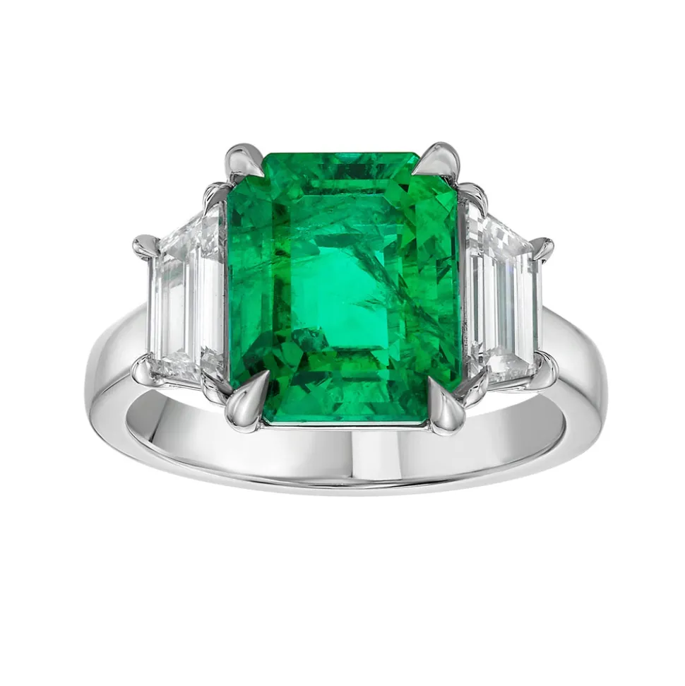 3.56 carats of emerald and 0.79 carats of trapezoid diamond (GIA #6475057156-VS2(F), #2477057243-VS2(F)). Set in platinum.