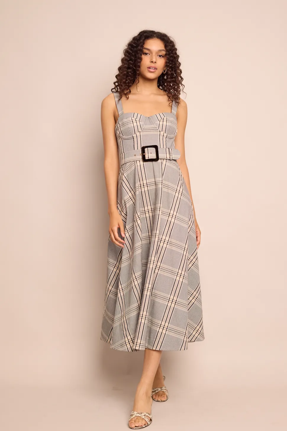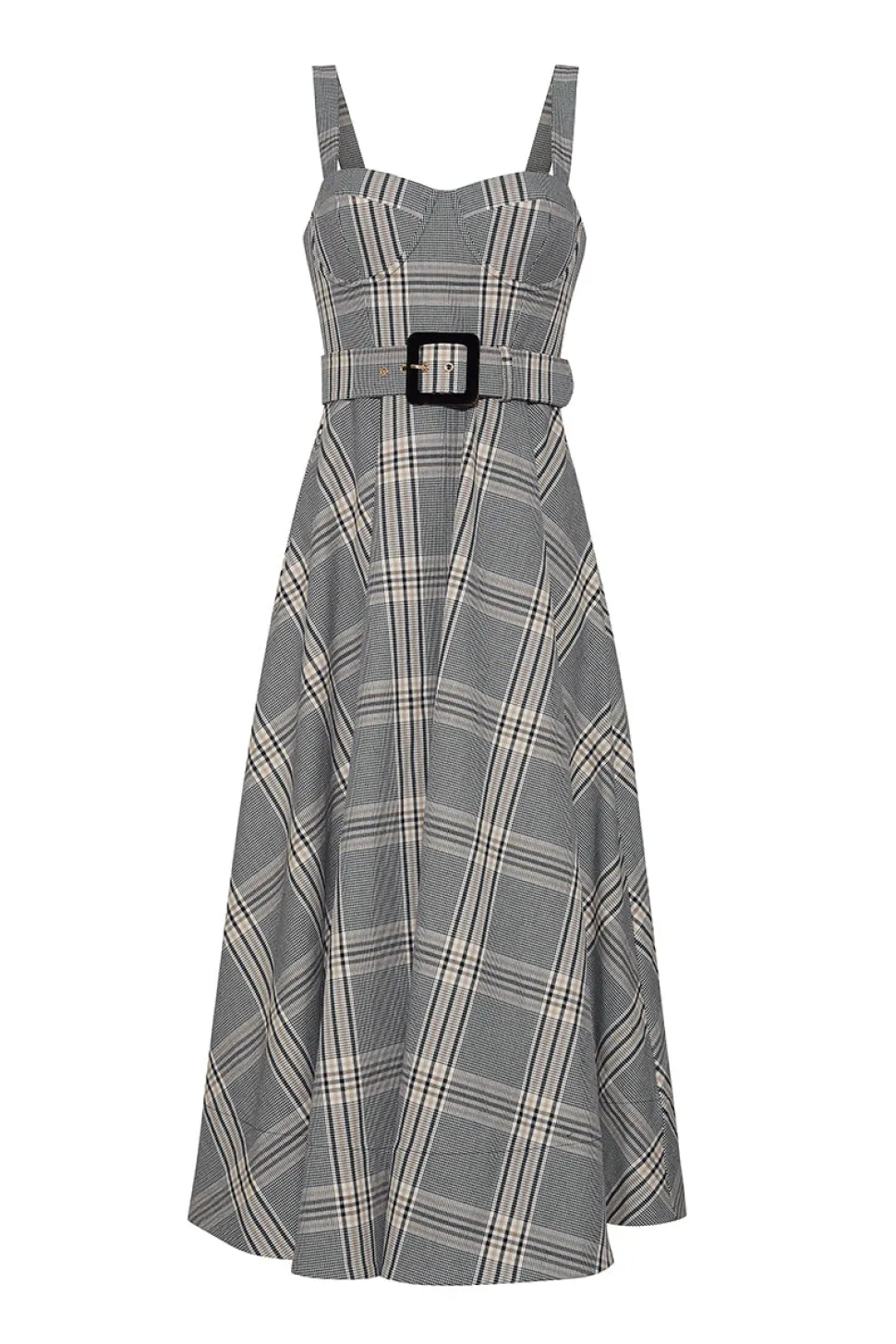 53% cotton, 41% rayon, 6% spandex. Fit-and-flare midi dress with structured bustier top, elastic straps, boning at bodice side seams, and metal underwire cups. Sweetheart neckline. Circle skirt with center front seam. Removable belt with velvet-covered buckle. Center back zipper with hook-and-eye closure. Elasticated smocking at back bodice. Functional side seam pockets. Fully lined bodice. Placed plaid.