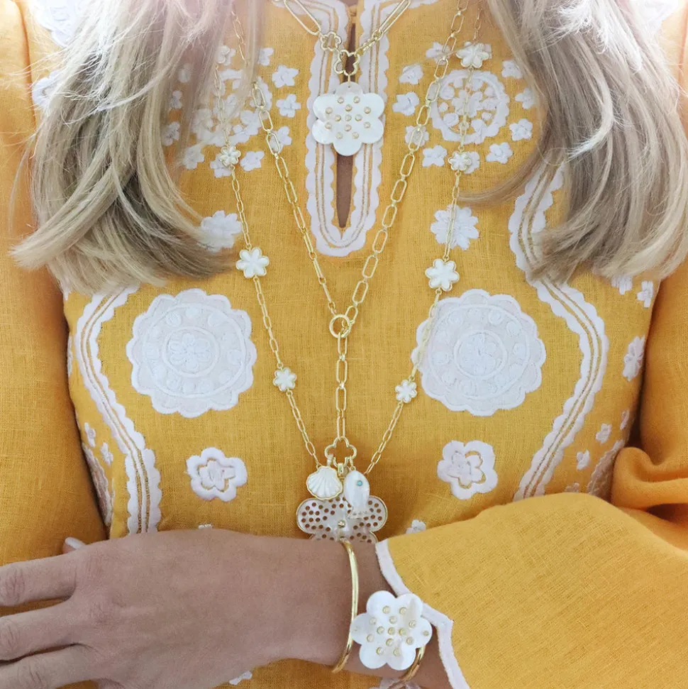 Inspired by art, architecture and the founder’s global journeys, ASHA by Ashley McCormick introduces bold, sophisticated jewelry and accessories made from only the finest materials. From everyday glamour to the red carpet, these statement pieces are classic additions to your collection. The popular Camellia style is now available in a new piece. Dipped in a 14-karat gold, the Camellia Cuff features an array of cubic zirconia and mother of pearl.