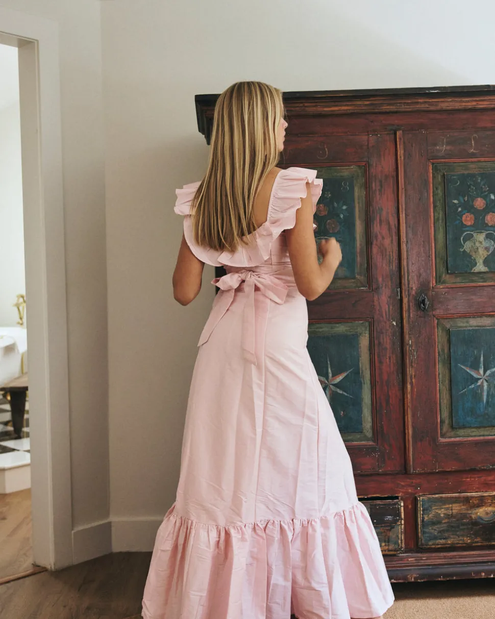 Louise New York creates its collection with the past and present in mind. Inspired by timeless glamour instead of trends, when you slip into a Louise New York dress, you carry all the confidence and carefree attitude that femininity can acclaim. The Camille Dress in Powder Pink sits at the natural waist with a bow tie back, has an elastic ruffle neckline that can be worn on or off the shoulders, an invisible side zip and flowy ruffle hem.