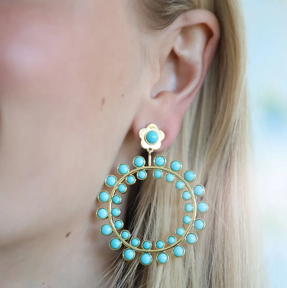 Inspired by art, architecture and the founder’s global journeys, ASHA by Ashley McCormick introduces bold, sophisticated jewelry, clothing, and accessories made from only the finest materials. From everyday glamour to the red carpet, these statement pieces are as eye-catching as they are classic. The Camille Hoop in Turquoise feature a feminine floral post. Small turquoise cabs adorn 14K gold dipped metal hoops.