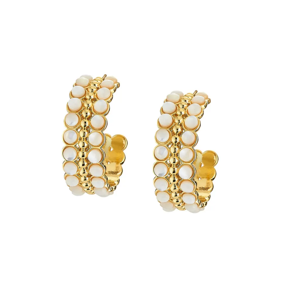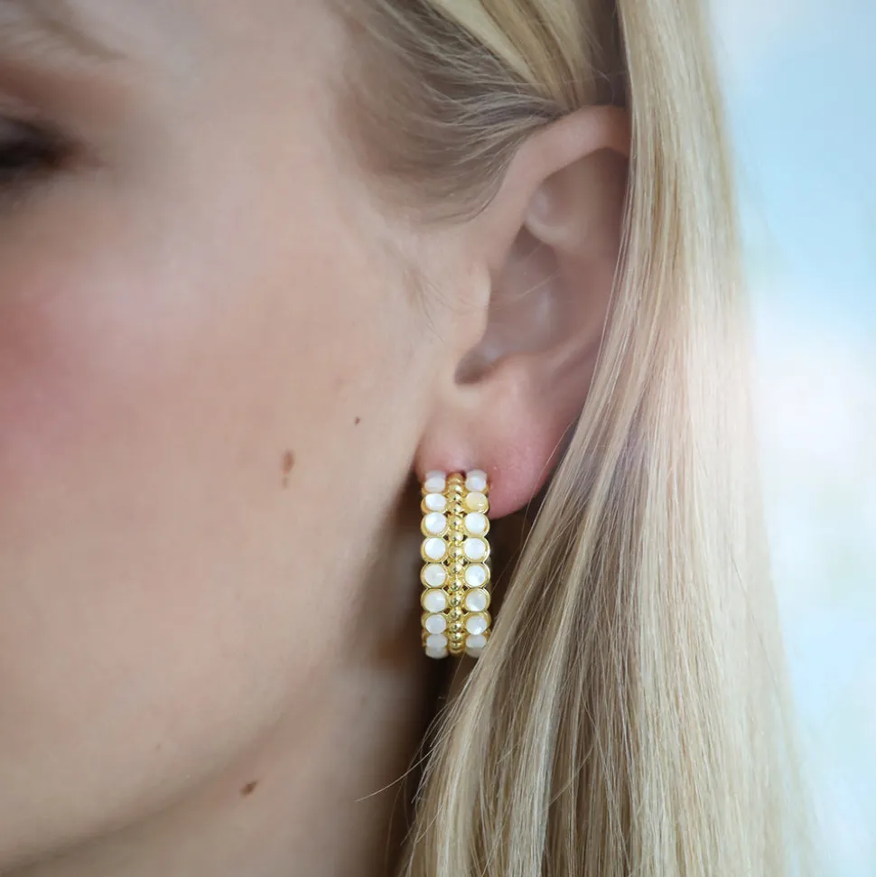 Inspired by art, architecture and the founder’s global journeys, ASHA by Ashley McCormick introduces bold, sophisticated jewelry, clothing, and accessories made from only the finest materials. From everyday glamour to the red carpet, these statement pieces are as eye-catching as they are classic. The Camille Huggie in Mother of Pearl feature small hoop that hug the lobe of your ear. Small Mother of Pearl cabs adorn 14K gold dipped metal.