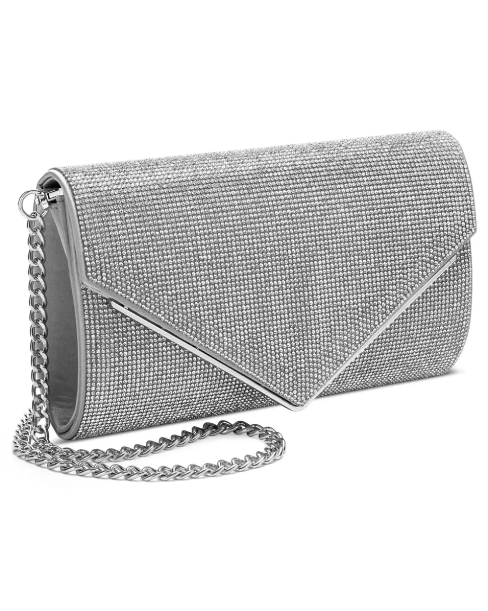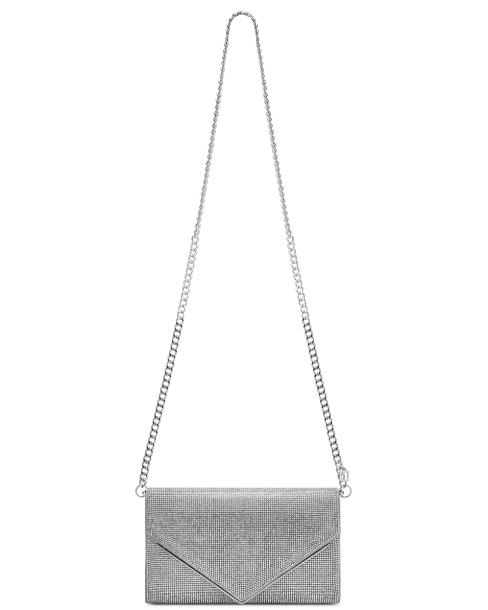 Envelope clutch in silver satin embellished with crystal rhinestones. Fully lined with removable shoulder chain strap.