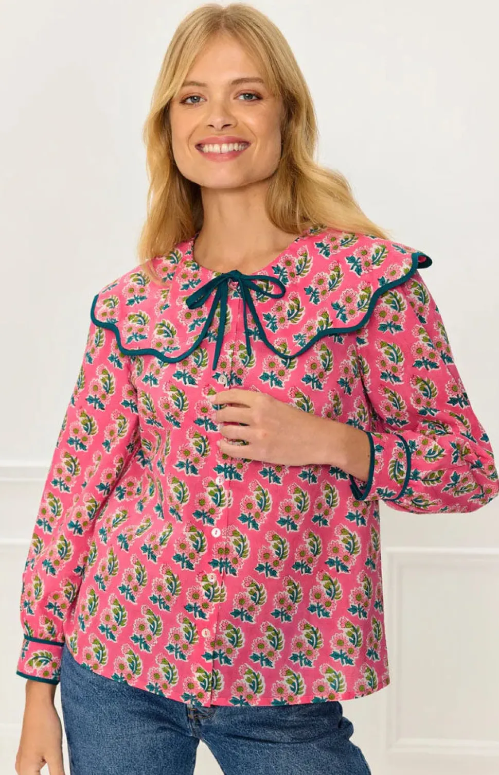 Color and creativity are the foundations of Pink City Prints, a brand inspired by founder Molly Russell’s life in Jaipur. In her inimitable dresses, you’ll find centuries of craft knowledge, expressed through unmatched quality and traditional techniques, like hand embroidery, block printing, and hand-looming. Crafted from soft, hand block-printed cotton in playful candy pink, the Candy Zinnia Apple Blouse is equal parts feminine and fun. Featuring a statement scalloped collar with bold blue piping and a neat placket-front opening, it layers beautifully under knits or stands out on its own with jeans — a versatile piece with bold charm.