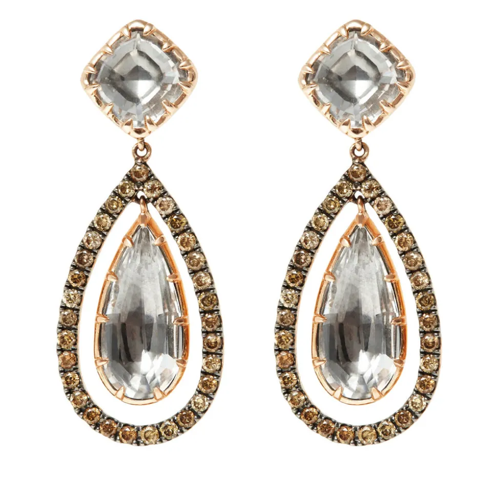 Solid 14K rose gold, white quartz (14 ct), and Champagne diamonds (1.55 ct) with gray foil, and 14K posts.