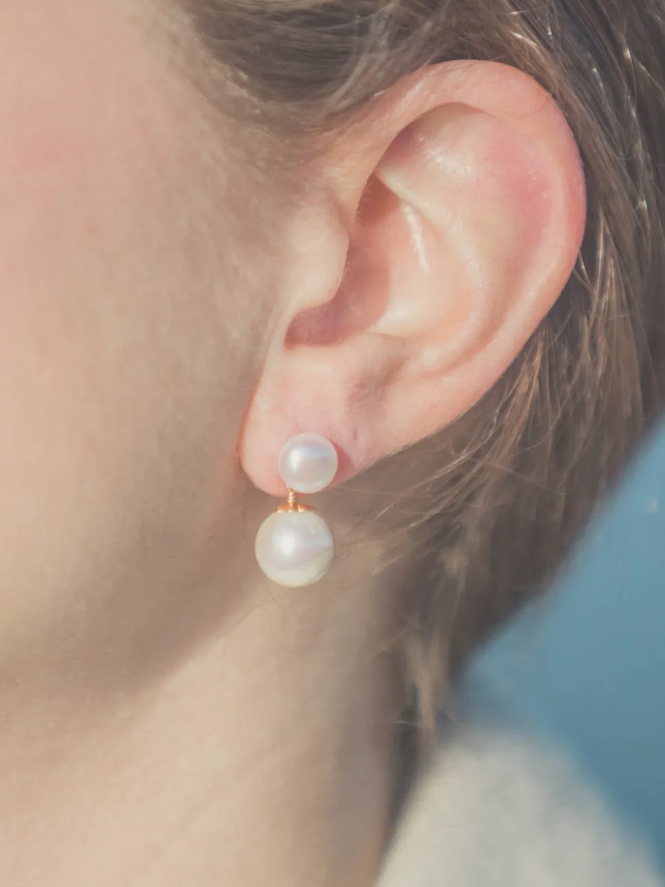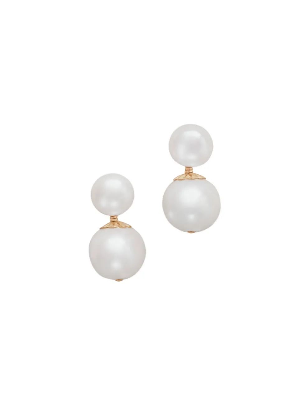 From Newport, Rhode Island, designer Kerry McGauley uses her experience in the fashion industry and inspiration from the town’s picturesque shoreline to craft singular yet timeless pieces—shining at the most special events, and through your everyday. Boasting a single, freshwater pearl, hanging from another by a gold-plated post, the Cara Earrings in White are at once classic, elegant, and modern.