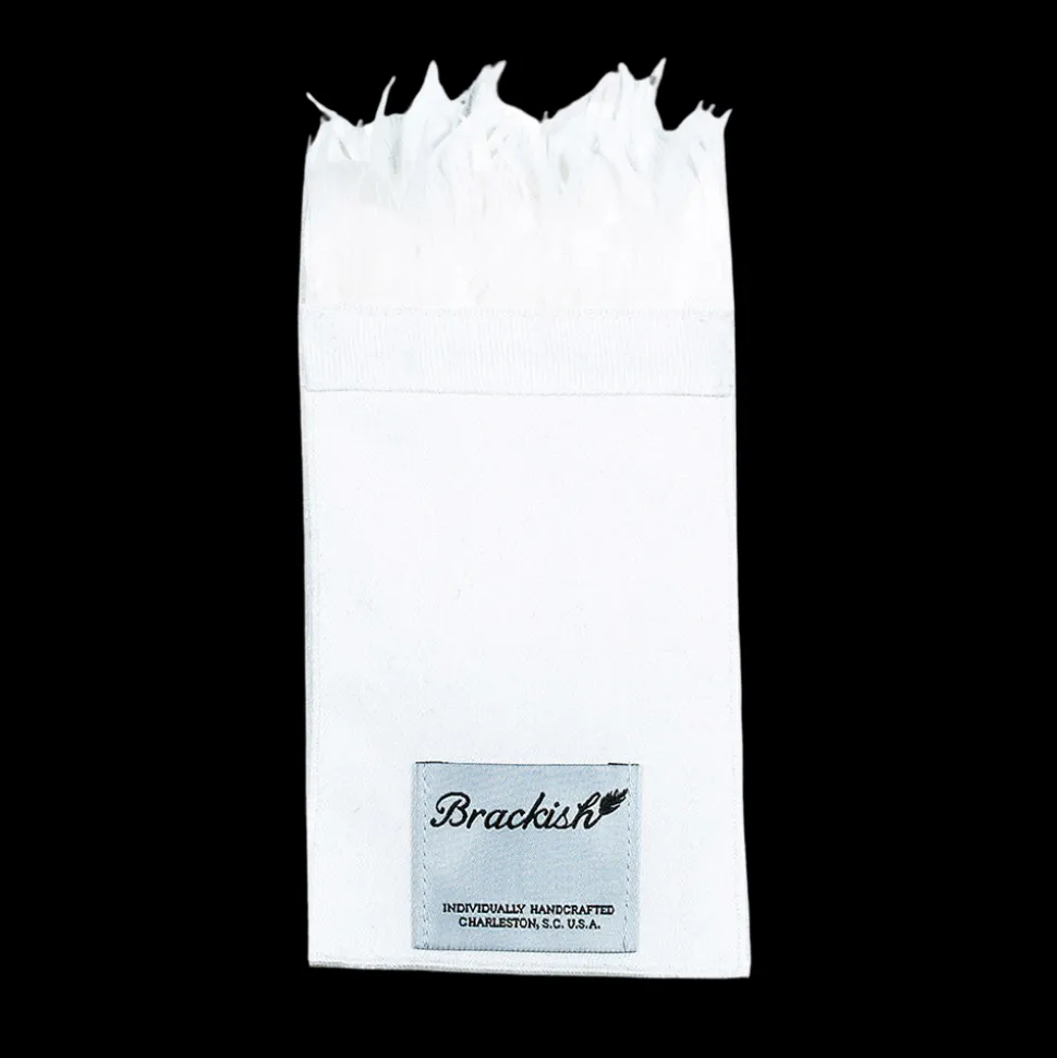 Brackish began with one feather bow tie designed by Ben Ross and gifted to his groomsman, Jeff Plotner. Since its inception, the brand has blossomed into a full line of men’s and women’s accessories designed and handcrafted in Charleston, South Carolina with each piece focused on honoring the beauty found in nature. The Carew Pocket Square is a completely bespoke piece made to fit any pocket size. Wear it parallel to your pocket, or with one corner creating a “peak” popping out. Control how much of the feather panel shows by pushing it deeper into the pocket. Made with goose feathers.