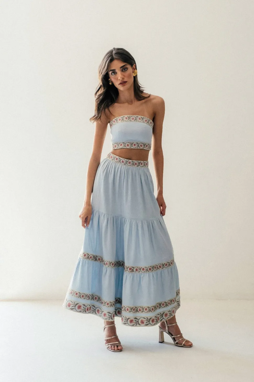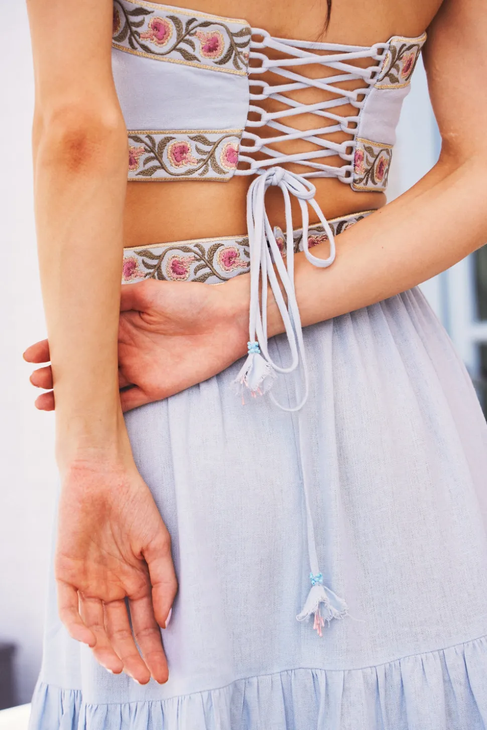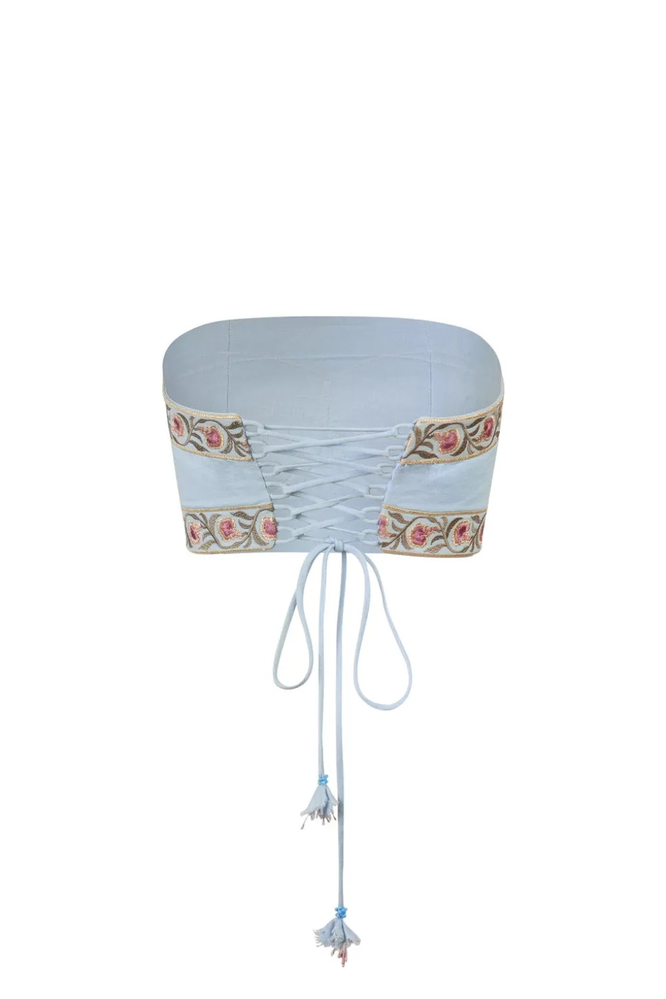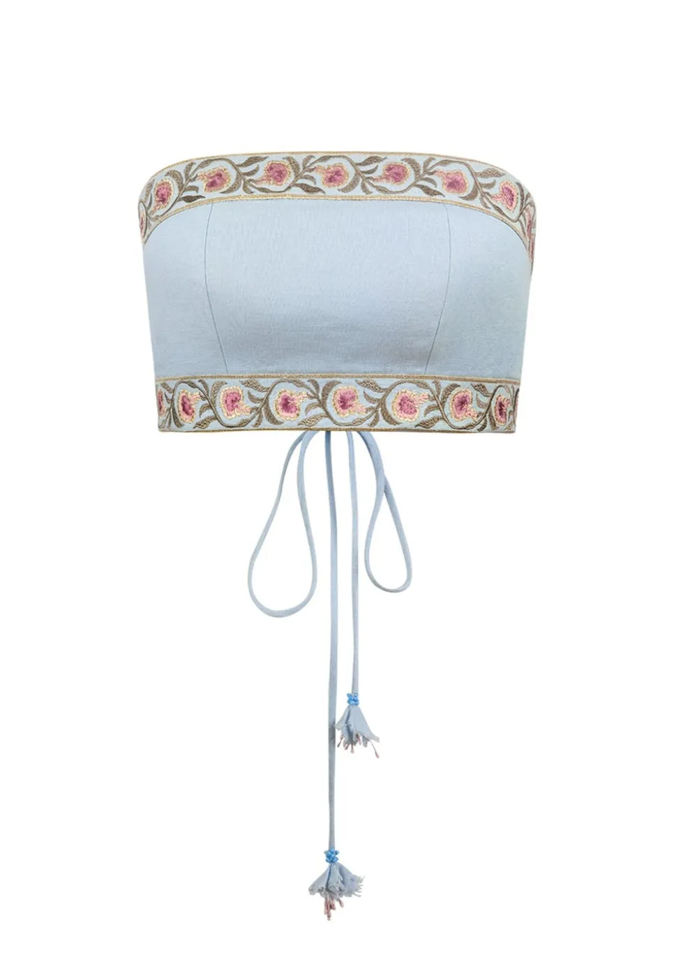 The brainchild of dynamic Iranian mother-daughter duo, Roshanak Varasteh and Leily Amirsardary Ahmed, RosewaterHouse is more than a fashion label; it is a testament to heritage, artisanal craftsmanship, and timeless design. Drawing inspiration from their cherished family heirlooms, Roshanak and Leily pay homage to the rich cultural tapestry of the Middle East, working exclusively with local artisans who breathe new life into age-old techniques, crafting exquisite, limited-edition garments that transcend age, style, and trends. These pieces are sure to become some of your most treasured. The Carnation Crop Top in Blue & Pink will surely make a statement anywhere you wear it with its intricately embroidered carnation pattern, a signature of the brand, finished with a rich gold piping. A laced bustier closure on the back and delicate handmade floral details on the tassels offer a superior fit and extra style. Wear it on its own, or pair it with the Carnation Skirt for a coordinating look.