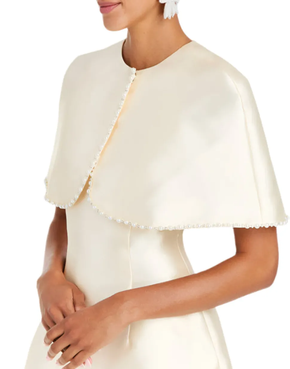 Silk poly blend. Elbow-length silk faille capelet. Be-jeweled pearl and gem embellishments along hem. Hidden button closure at top center of capelet.
