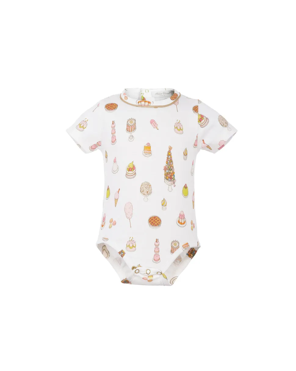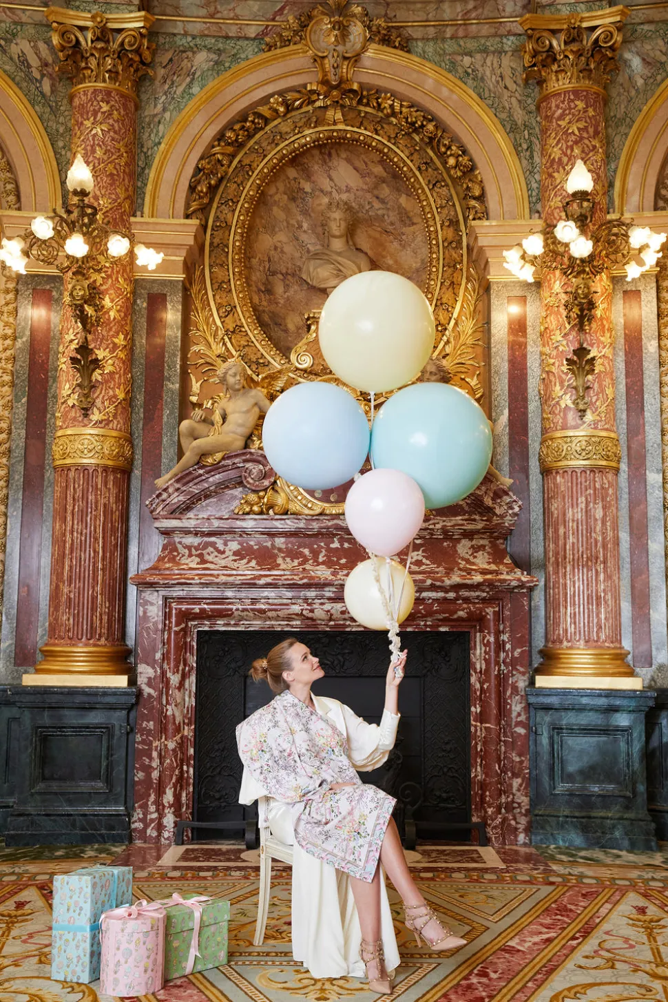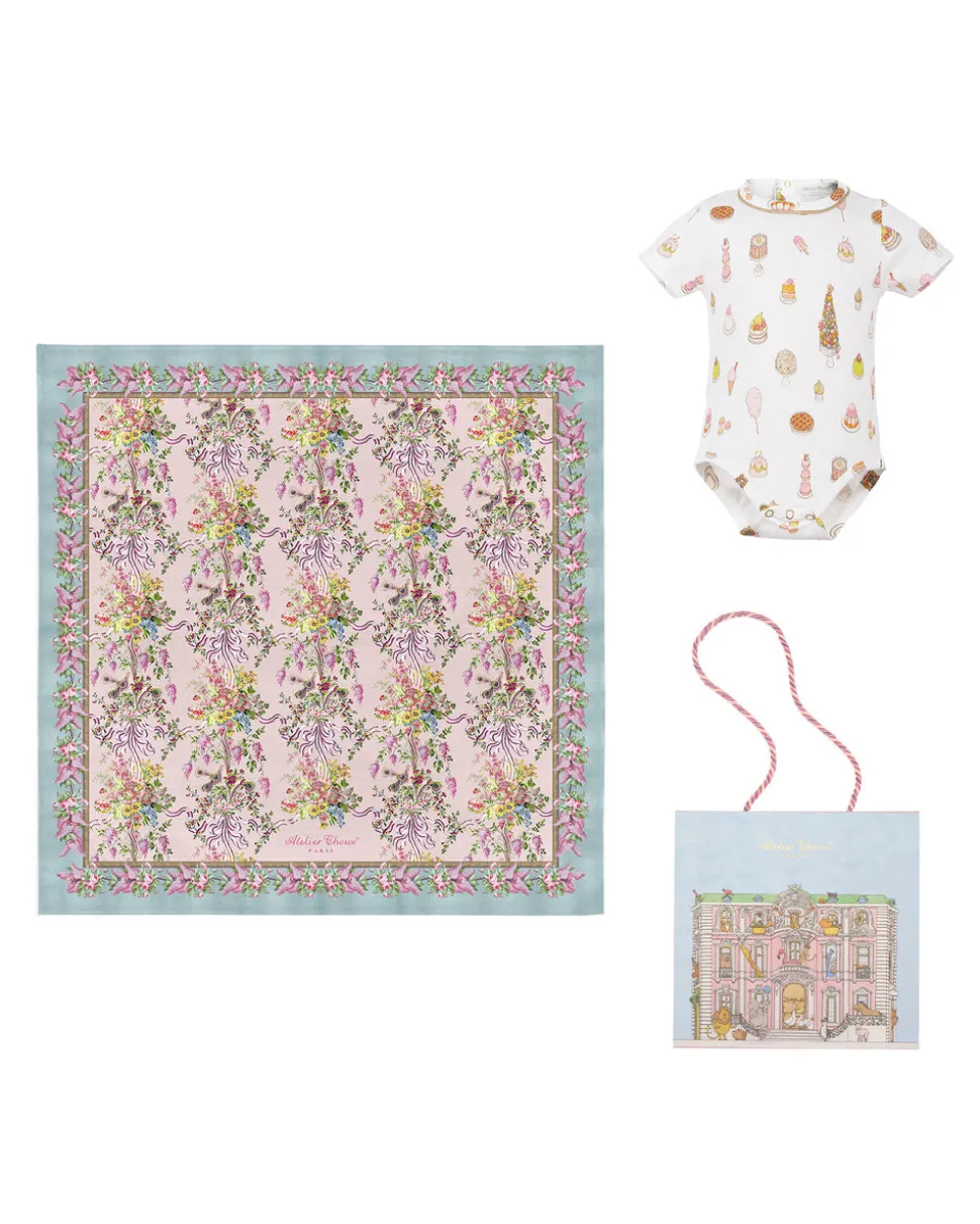 A new French maison for millennial families, Atelier Choux is a lifestyle brand that focuses on interior design in its bedding, textile accessories, wall décor, clothing, and collectible gift boxes. Inspired by Troisième Empire Parisian architecture, each item balances tongue-in-cheek humor with sophistication, revealed in recurring themes like elaborate buildings, simple charismatic animals, fanciful crests, and hot air balloons. The Carre Marie Antoinette & Onesie in Sweetie Pie is the ultimate Parisian baby gift. This gift set includes an Atelier Choux carré (light blanket)—ideal as a chic stroller accessory, photo background, or tablecloth during playtime or mealtime—and one Sweetie Pie Onesie, the brand’s signature, gender-neutral print on luxurious cotton. Neckline includes a golden Atelier Choux stud and gold piping, sourced from Japan. This set comes in Atelier Choux’s signature gift box, with a magnetic closure and a silk carrying cord.